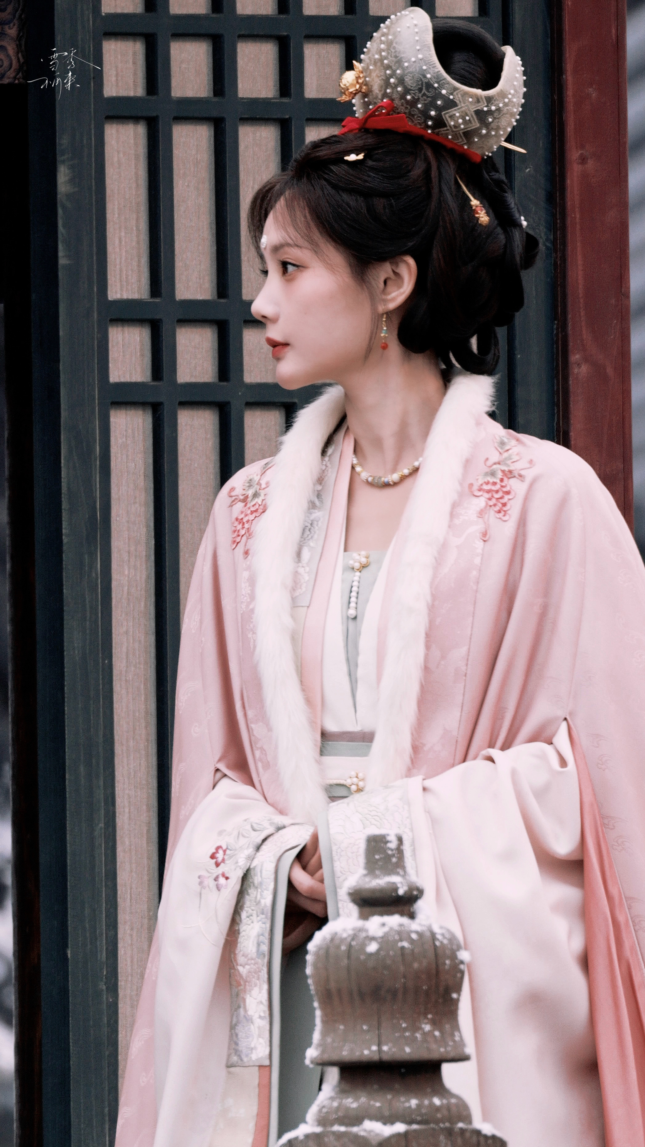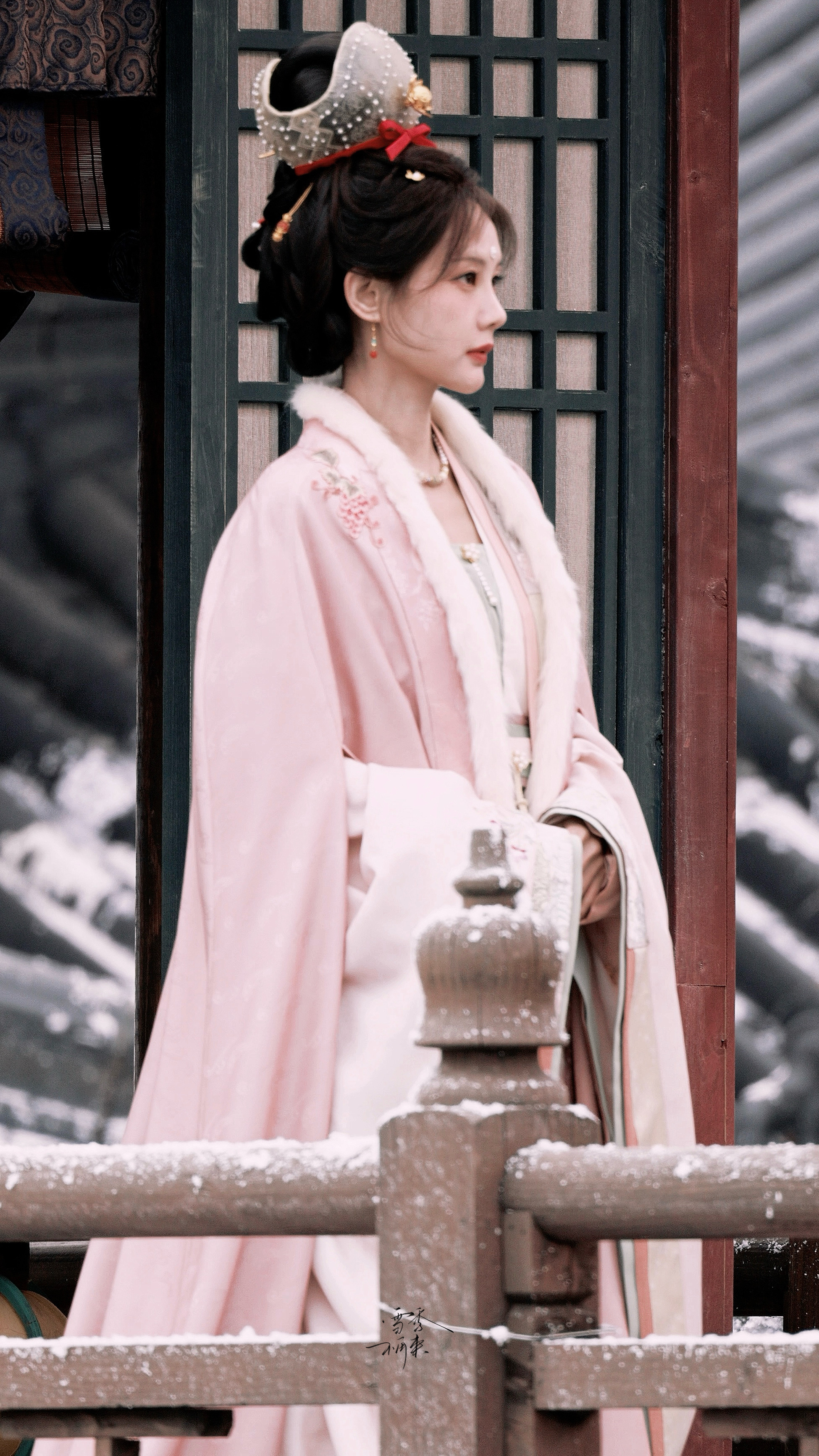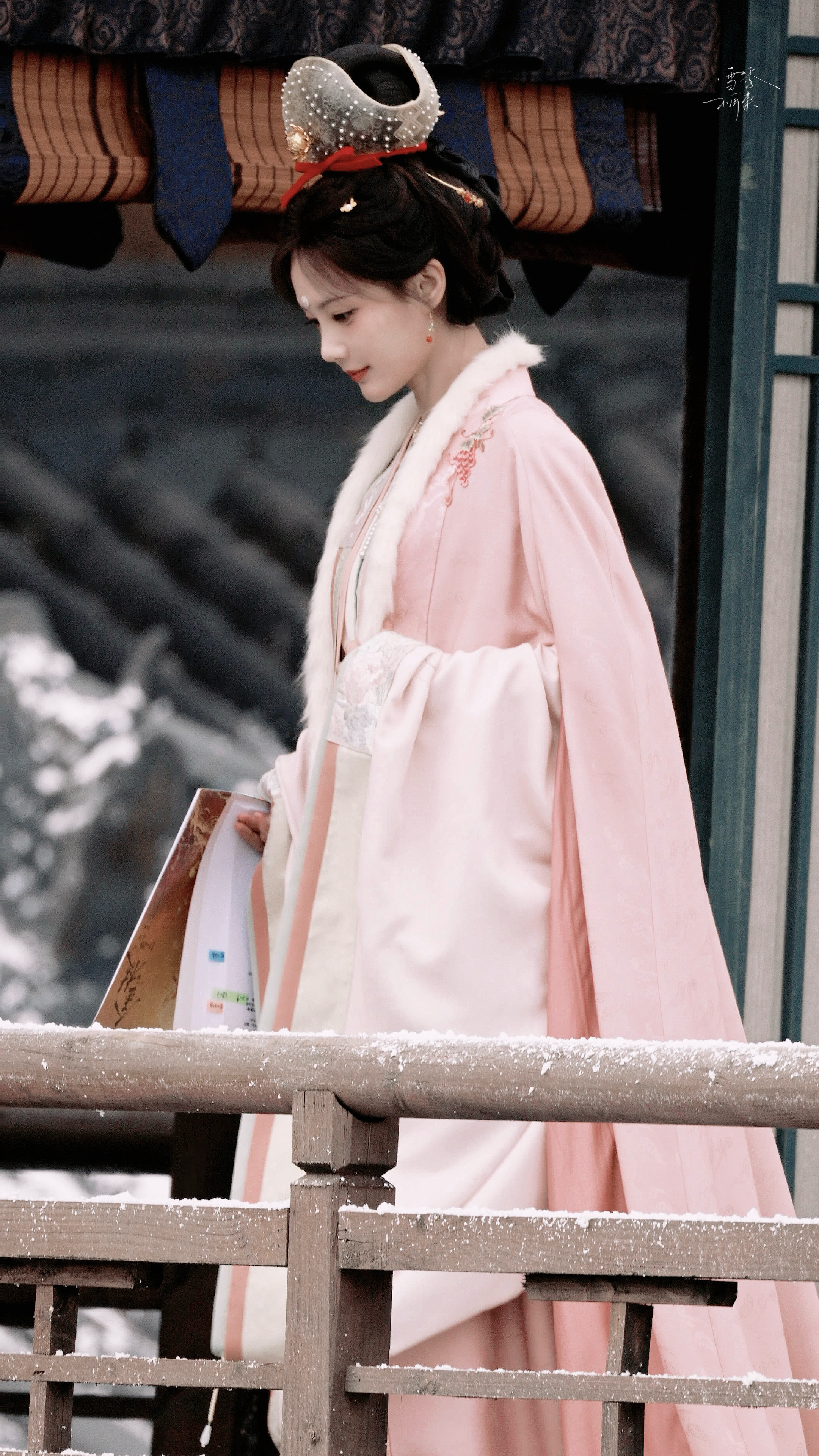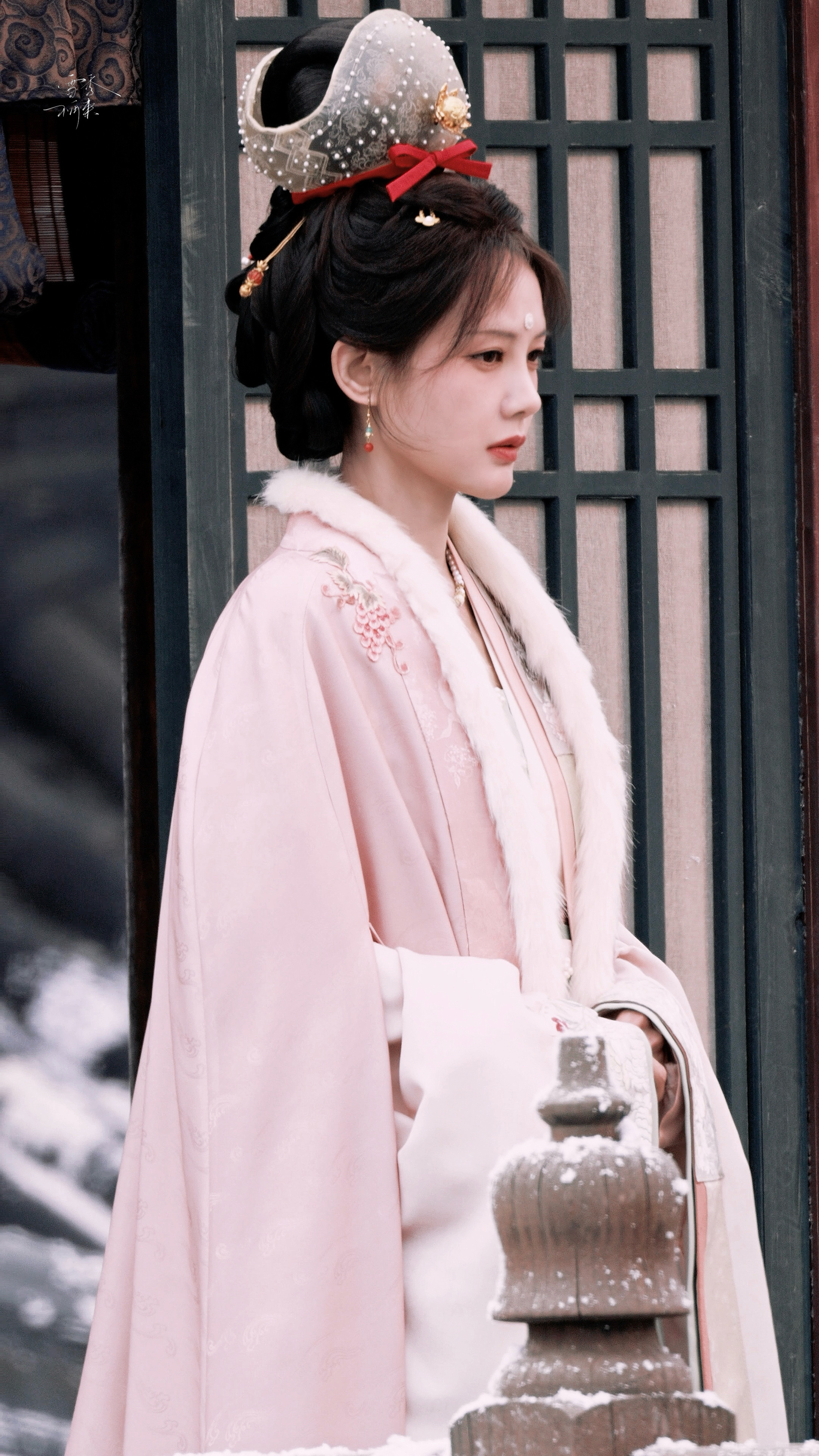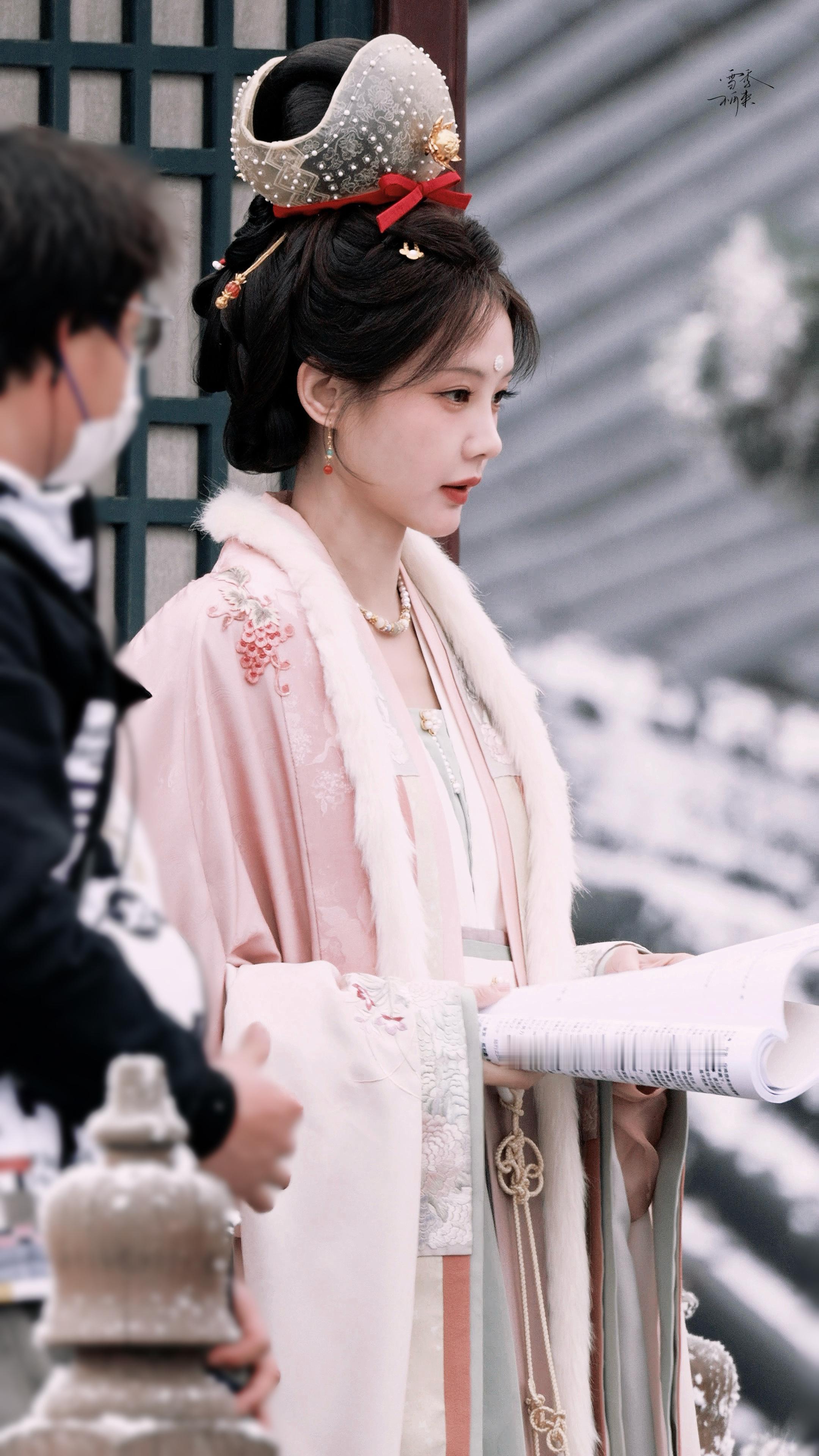 !好漂亮的新造型~~~李一桐《金枝》陈雀儿☽路透-粉衣+毛领+花冠+珍珠妆