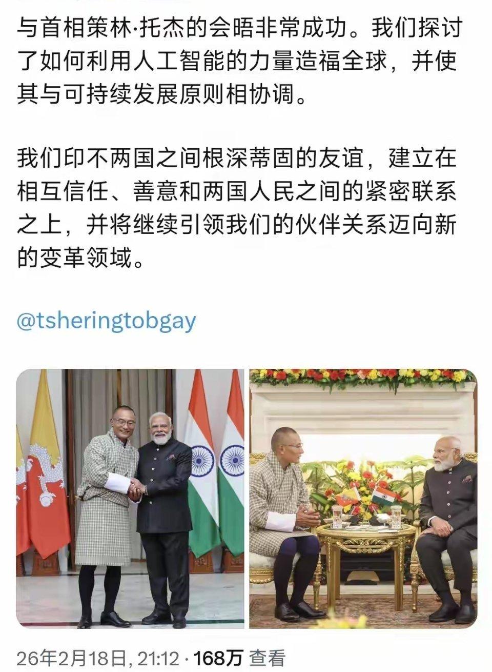 印度总理莫迪发文 宣称 和不丹首相探讨了如何利用AI来造福全球!