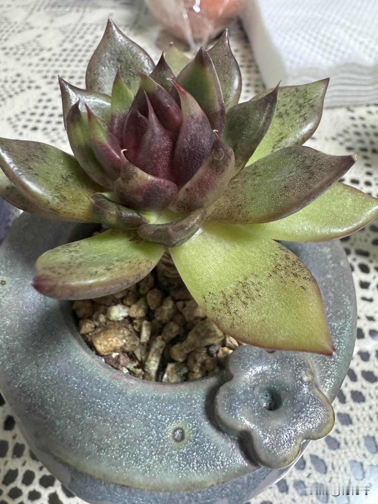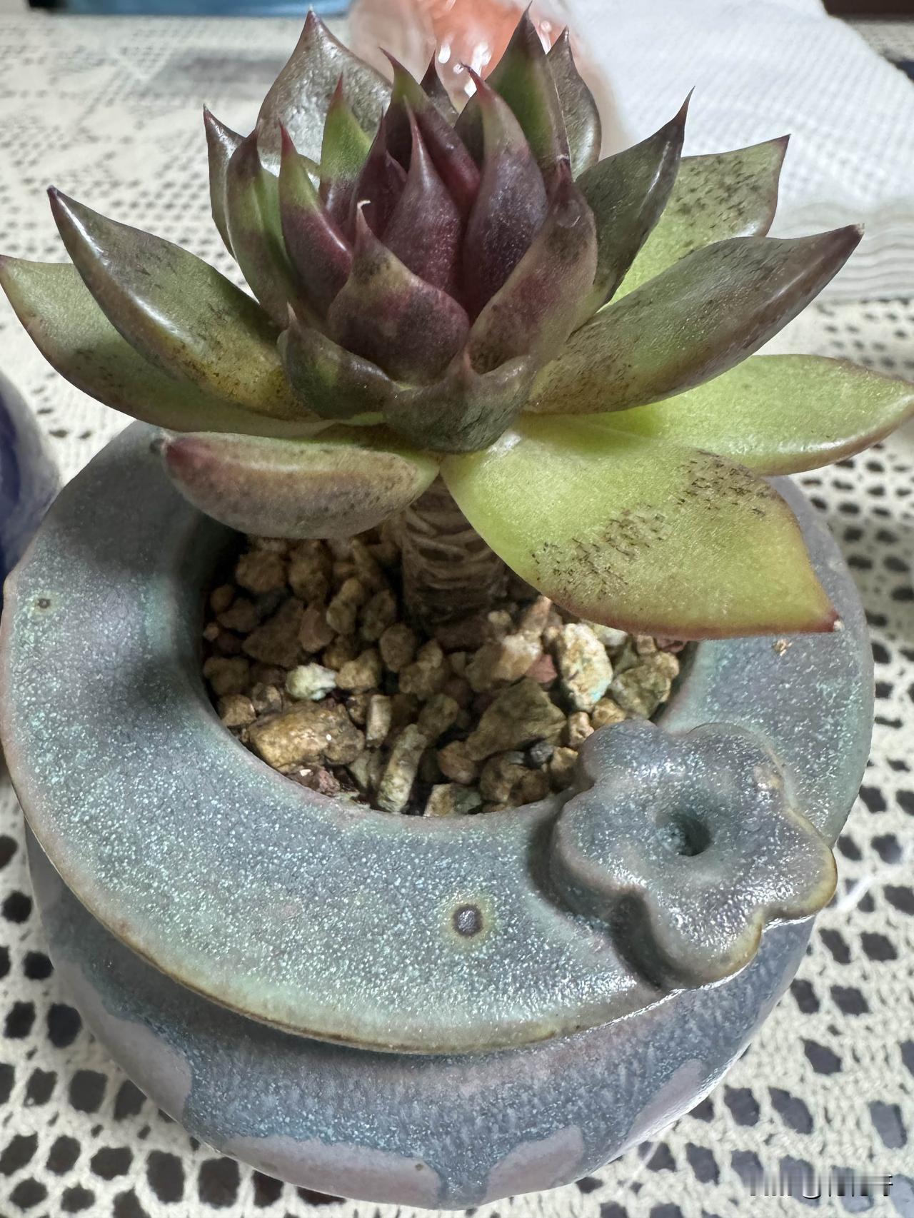 两年前买多肉送的一颗小崽子,当时小的不得了,肉眼强看见,差点没让我扔掉,想想还是留下了,后来把它插在一个大盆多肉里,没想到它还没让我失望悄悄的长大了,然后我把它移到这个我喜欢的花盆里,它越来越好看,里面都出糖心了,就是到现在我都不知道它叫什么名字。2026年2月19日