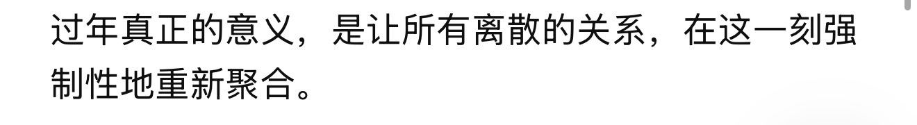 我认为的过年是让大部分人节奏放缓,家人团圆(因为现在仍有不少留守儿童),对于很多人来说,可以在过年进行短暂的修整,没有压力的过几天自己想要的生活。