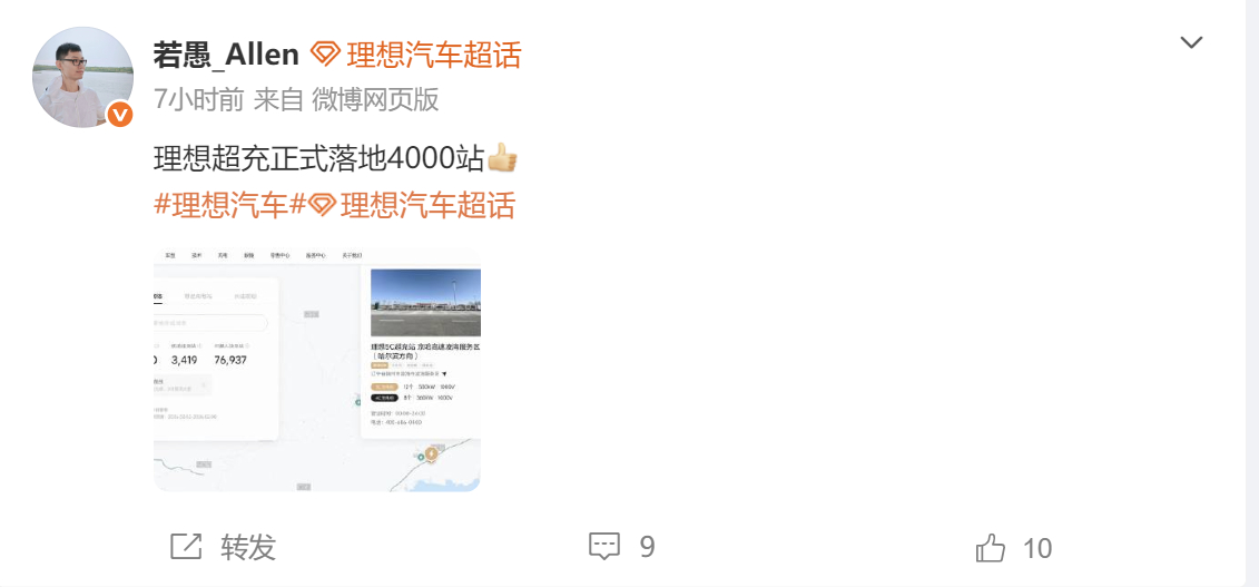 【理想汽车超充站正式落地4000站】理想汽车产品经理 今日宣布,理想汽车超充站正