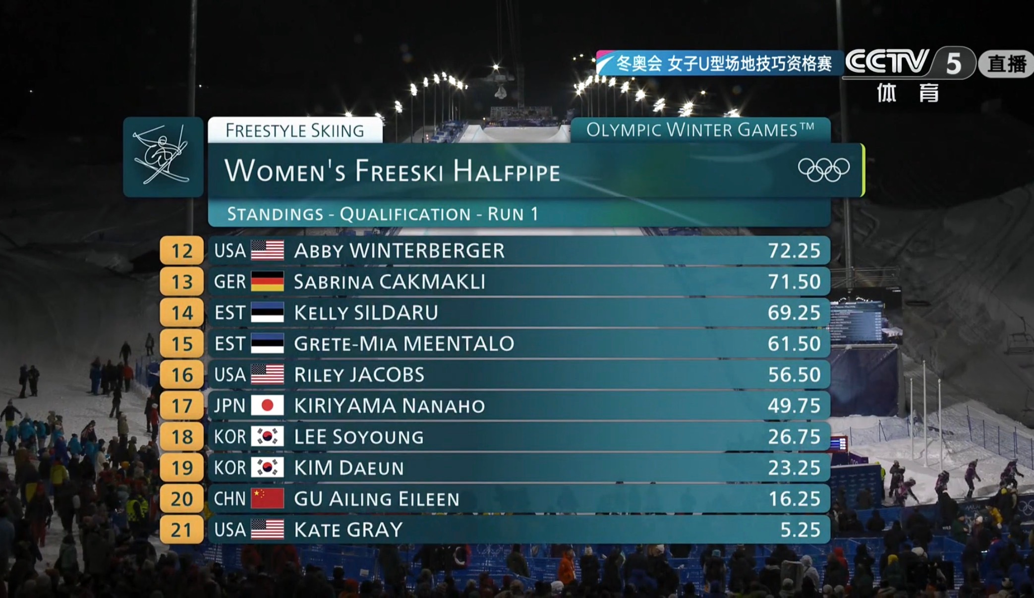 谷爱凌U型场地技巧预赛 谷爱凌再玩心跳,在第一滑摔倒仅拿到16.25分的情况下,第二滑平稳顺下来获得86.50分,稳进决赛了!