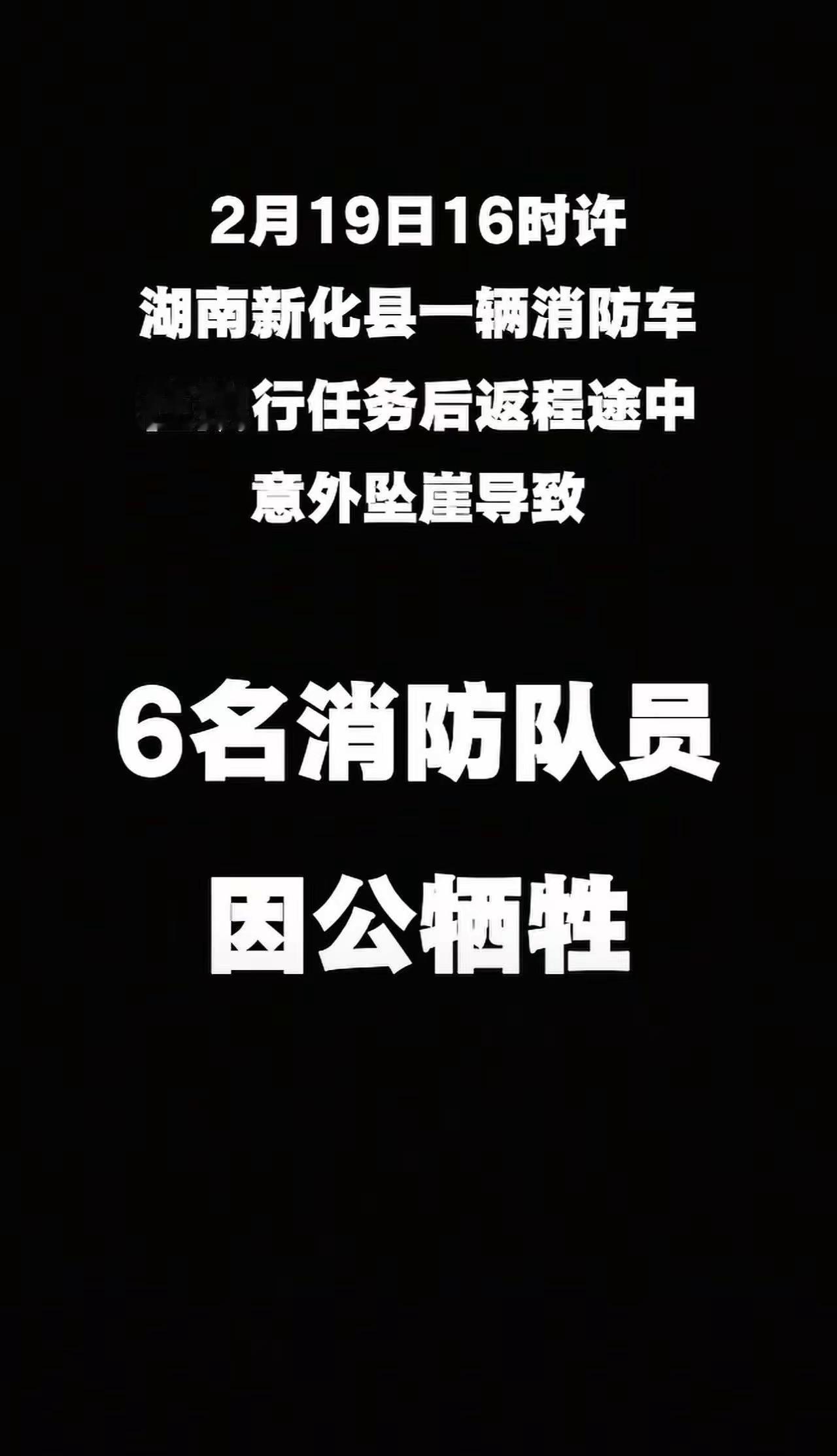 湖南新化一辆消防车坠崖 6名消防员因公牺牲 记者从湖南省新化县相关部门获悉,2月19日16时许,新化县消防救援局一辆消防车在当地炉观镇完成灭火救援任务后,返程途中意外坠崖,导致6名消防队员因公牺牲,1名消防队员受伤。目前事故原因调查、伤者救治等善后工作正在进行。