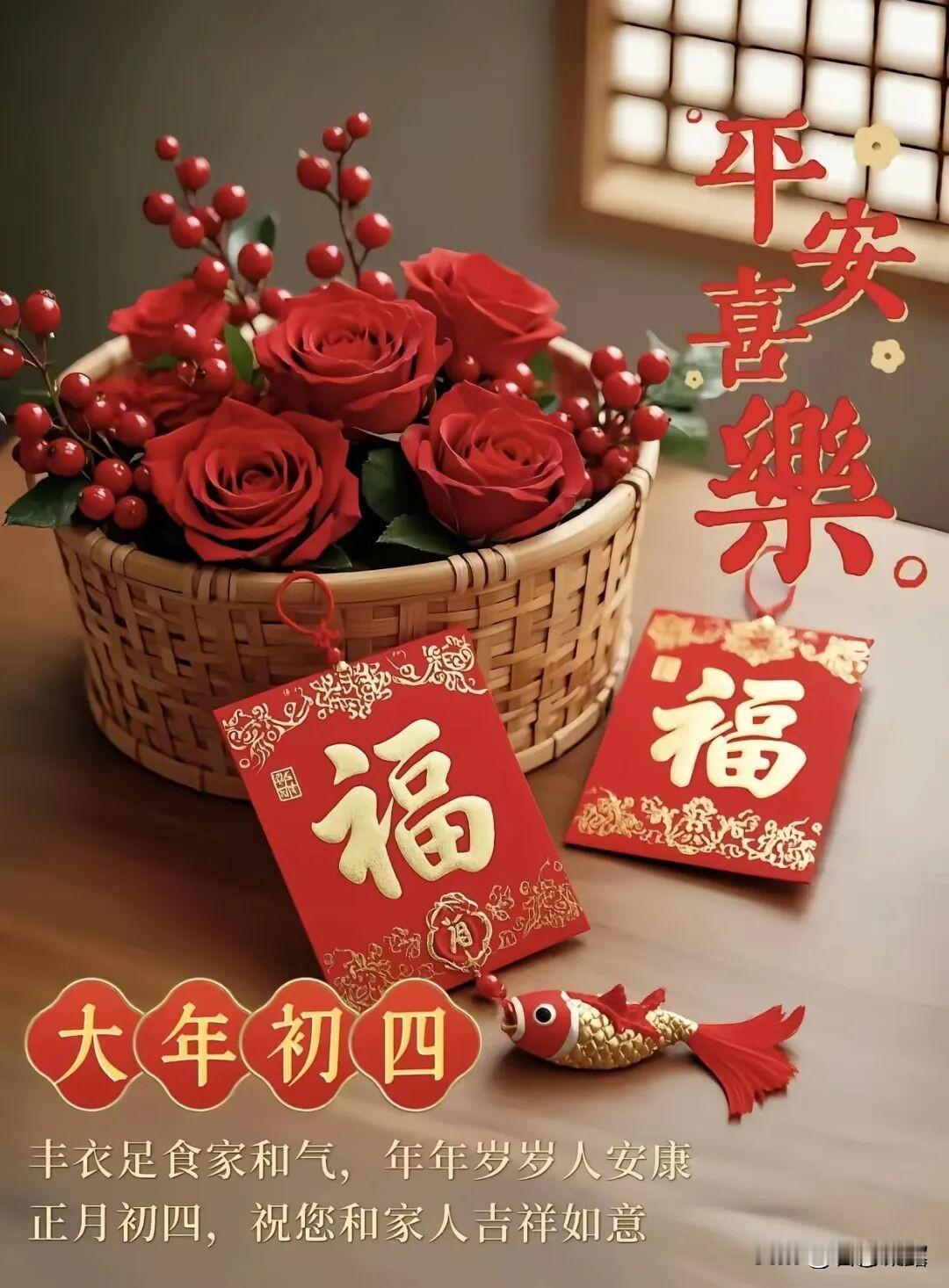 大年初四拜个年,平安喜乐常相伴,家和业兴万事安。愿初四如意,安居乐业,岁岁静好,