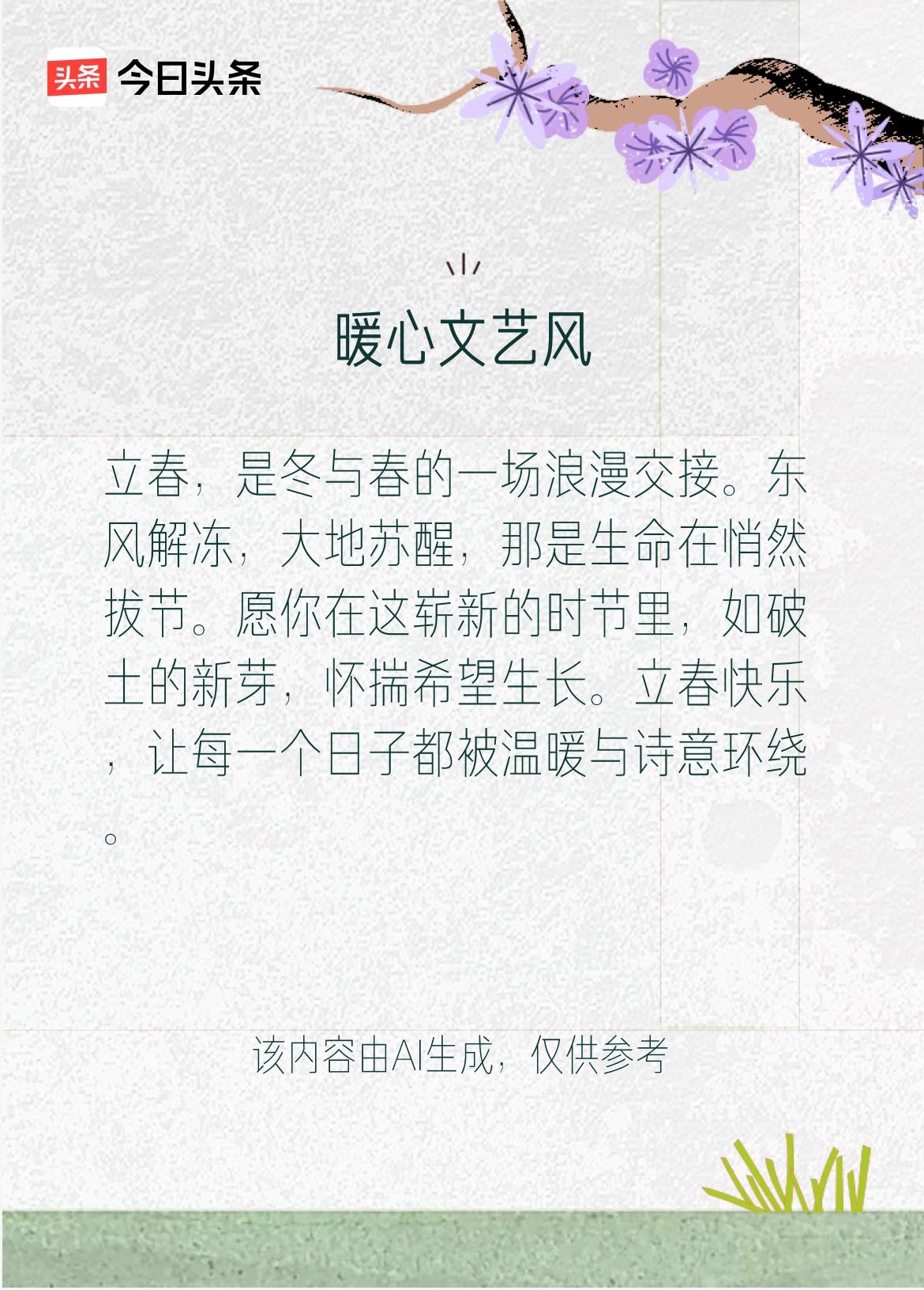 文学创作大会 立春,真的是一场超浪漫的季节交接!就像诗里说“东风一夜入望垠,淑气初回万象新”,东风一吹,大地仿佛被唤醒,一切都有了新模样。野水潺潺滋润着秀草,新莺啼叫报来芳春。 看着柳眼初青、梅腮粉匀,心情也跟着明媚起来。在这崭新时节,每个人都像破土新芽,怀揣希望生长。 现在这个文学创作大会超棒,能让我们用诗词歌赋描绘立春之美。说不定还能赢万元大礼呢,赶紧戳进去和大家一起创作,让日子都被温暖与诗意环绕!