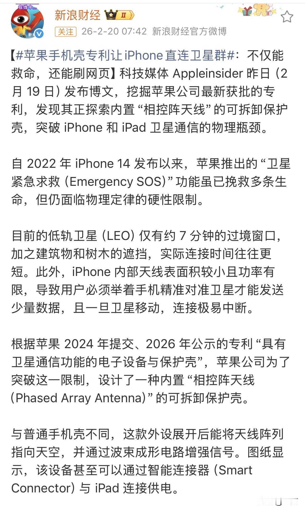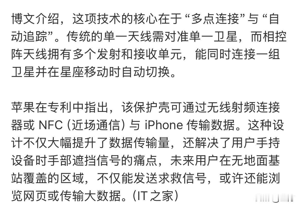 苹果新专利来了:可以直接连卫星群! 根据相关数码博主的报道,苹果最近申请了一个新的专利,可以直接与天上的卫星连接,但是它与我们国内华为小米手机的连接方式不一样! 它采用的是专门生产的一款手机壳,这个东西就像NFC一样,可以让手机实现一种新的数据传输,不仅仅可以在手机与手机之间实现快速的文件传输与数据转移,而且还可以直接连到天上的卫星! 就是说这个,苹果最新的这个手机壳,会改变后果之间的数据传输,不仅仅是苹果手机之间,而且还可以实现苹果与其他设备,比如他的电脑和iPad等,数据的互通互联! 当然,关键的是它可以让苹果的信号变得更好,只是不知道这个手机壳之前的iPhone手机能不能用,如果也能用的话,那就意味着至少会让之前的iPhone信号变得更好,当然如果要实现之前的iPhone手机直连卫星群,那就真的太棒了! 目前这个专利才刚刚申请出来,估计要完全应用到市场,还需要一段时间,到时候看看,这个功能是针对特定版本的iPhone还是历代iPhone都行,对于现在的很多苹果用户来说,这一点是很重要的。