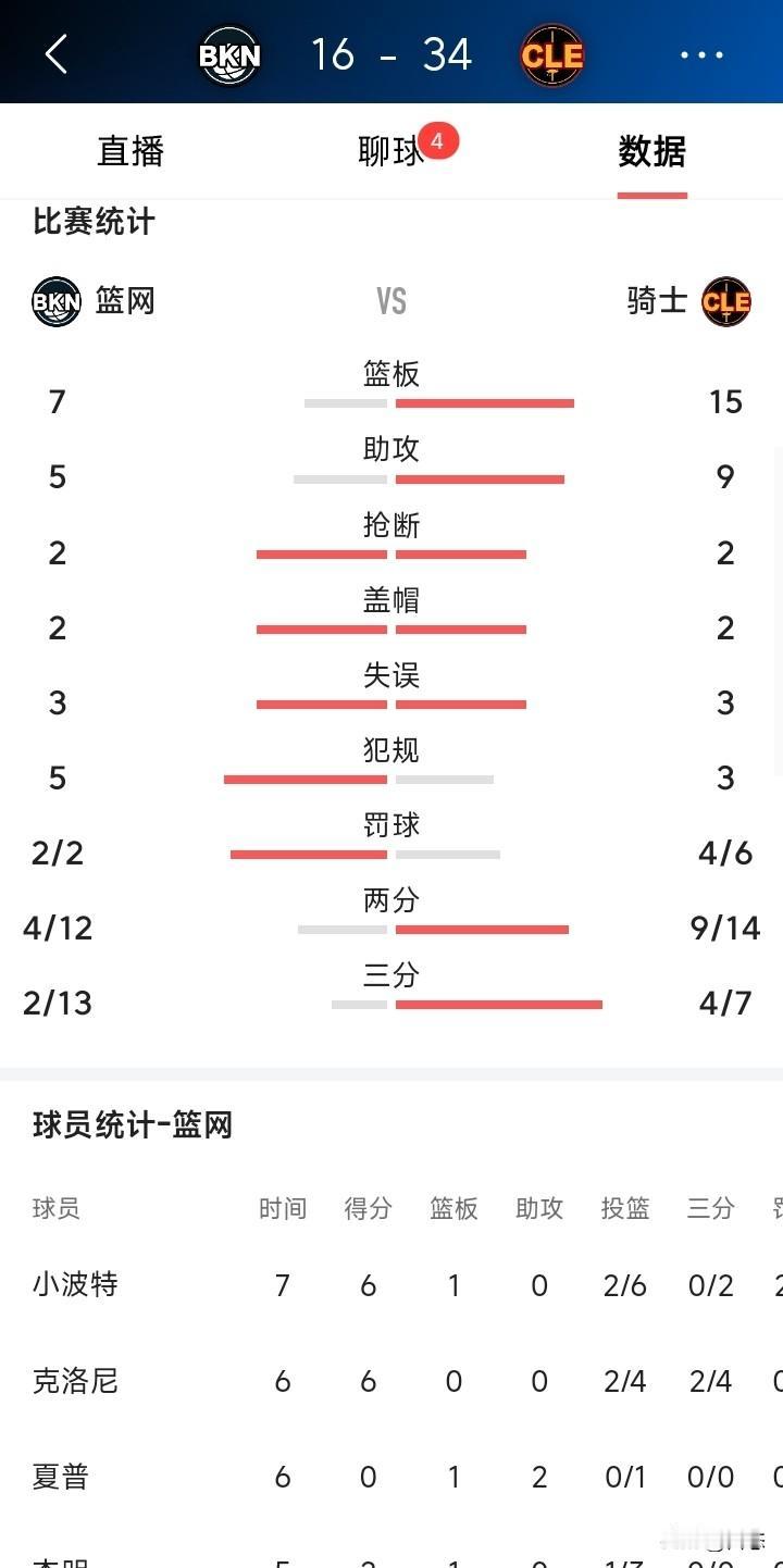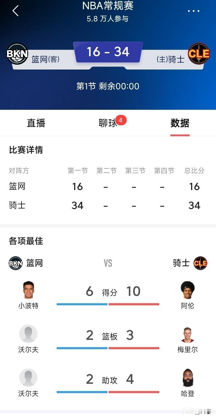 全明星周末后,NBA终于开打了,今天骑士对阵篮网,第一节已经结束,骑士34比16,赢了18分。骑士主力命中率太高了,哈登一节只打了7分钟,骑士打球的人太多了,个个都能得分。哈登好久没有打过这么富裕了仗了。大概率拿下篮网。 希望哈登带领骑士冲出东部。