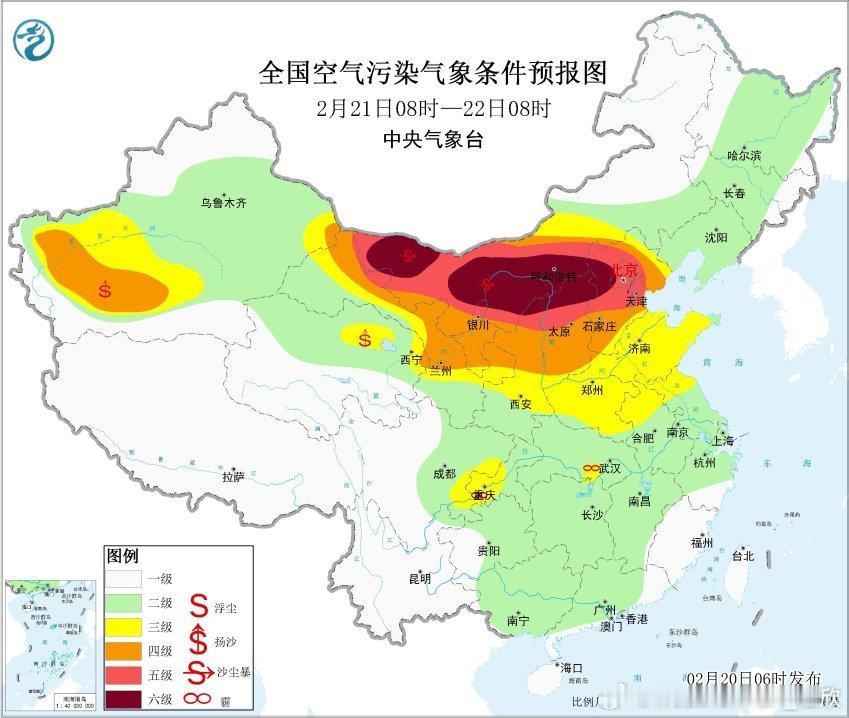 受冷空气大风影响,预计2月20日08时至21日08时,新疆东部和南疆盆地、内蒙古西部、甘肃西部、宁夏中北部、陕西北部等地有扬沙或浮尘天气,其中,内蒙古西部、甘肃西部、宁夏北部等地的部分地区有沙尘暴,局部有强沙尘暴。21-22日沙尘还会不断向东向南传输,影响华北黄淮甚至长江中下游地区。
