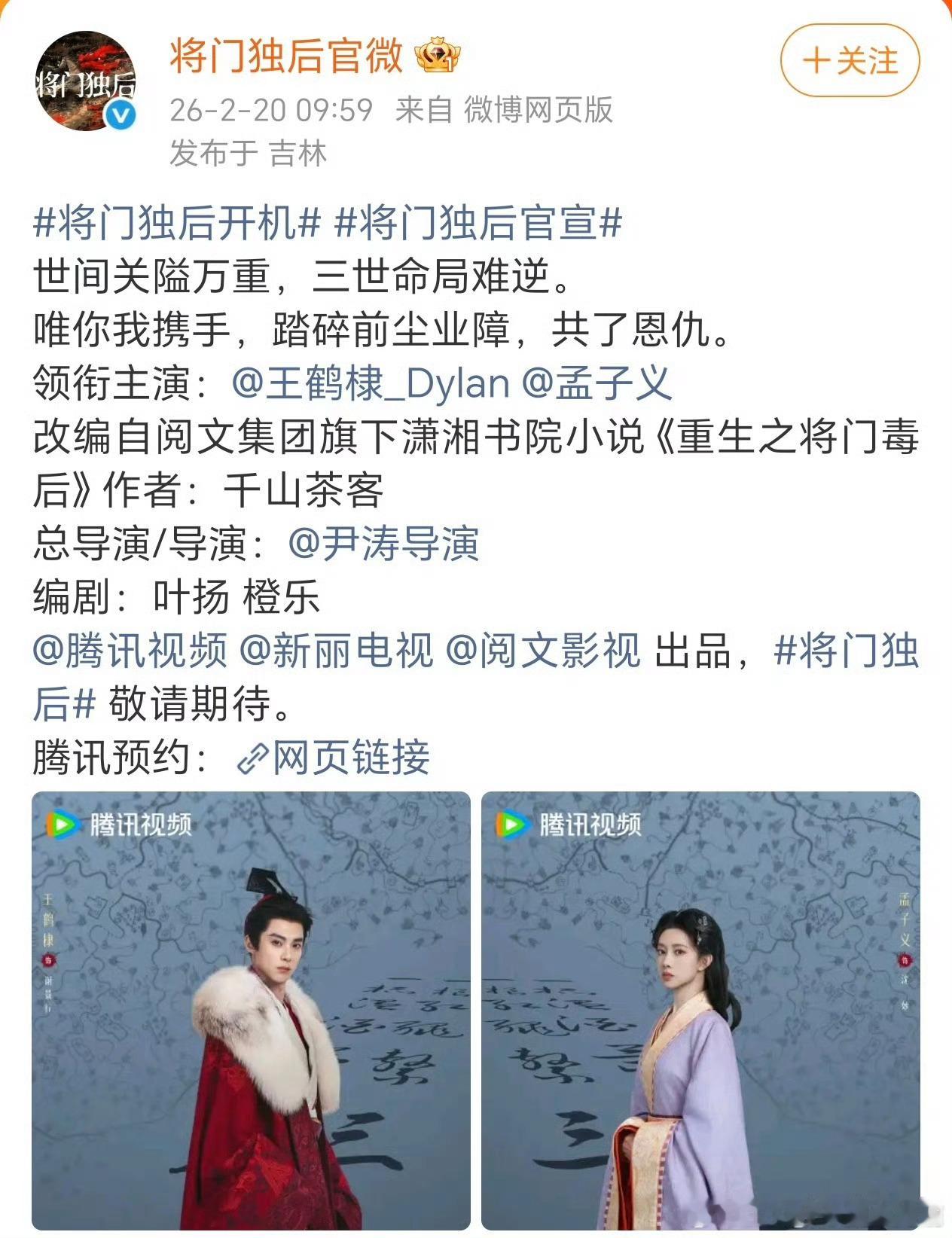将门独后官宣,番位明确,王鹤棣一番,孟子义二番