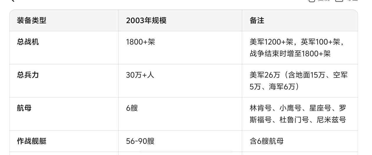 美国用了43天推翻萨达姆政权,花了9年也没有爬出伊拉克战争泥潭,耗资超3万亿美元。 特朗普一定不希望在伊朗重演,无论他喊多凶,都不会动用地面部队进入伊朗。 4月9日占领巴格达宣告萨达姆政权垮台;5月1日布什宣布主要军事行动结束 。 地面部队仅用43天击败伊军,联军阵亡仅168人,呈现"一边倒"态势。 然而此后9年美军陷入长期游击战困扰,约5.2万人(含伤病),死亡4419人。 这次战争美国付出巨大成本。据诺贝尔经济学奖得主斯蒂格利茨/比尔梅斯统计(2008):总成本超3.0 万亿美元(含利息、长期伤残、机会成本),其中: 1- 直接军事行动:7500–8000 亿美元 2- 退伍军人医疗、伤残、抚恤:6000 亿美元+ 3- 装备重置/维护:5000 亿美元 4- 债务利息(借钱打仗):4000 亿美元+ 5- 重建、外交、情报、安保合同:剩余约 7000 亿 当然也有很多人得利,比如当时的副总统切尼名下的军事承包商获得大量合同。 特朗普曾多次表示要吸取伊拉克战争的教训。 2003年美军集结的战机多达1800多架,而目前美军战机也只有500-600架,另外还有多个国家禁止参与对伊行动。 而伊朗目前的军事实力是当时伊拉克无法比拟的,伊拉克经过多年制裁萨达姆政权已经难以维持。 而且伊朗境内广泛分布的山地地形非常适合隐蔽,无论是躲避美军轰炸,还是战后打游击都比伊拉克有优势。 所以特朗普虽然喊得凶,但内心一定不希望深度卷入长期对伊战争。 美国目前更希望通过一次短期空袭军事行动迫使伊朗屈服,然而已经被伊朗看破,伊朗同意核问题让步,其他问题咬死免谈。 其实特朗普已经到了骑虎难下的地步。