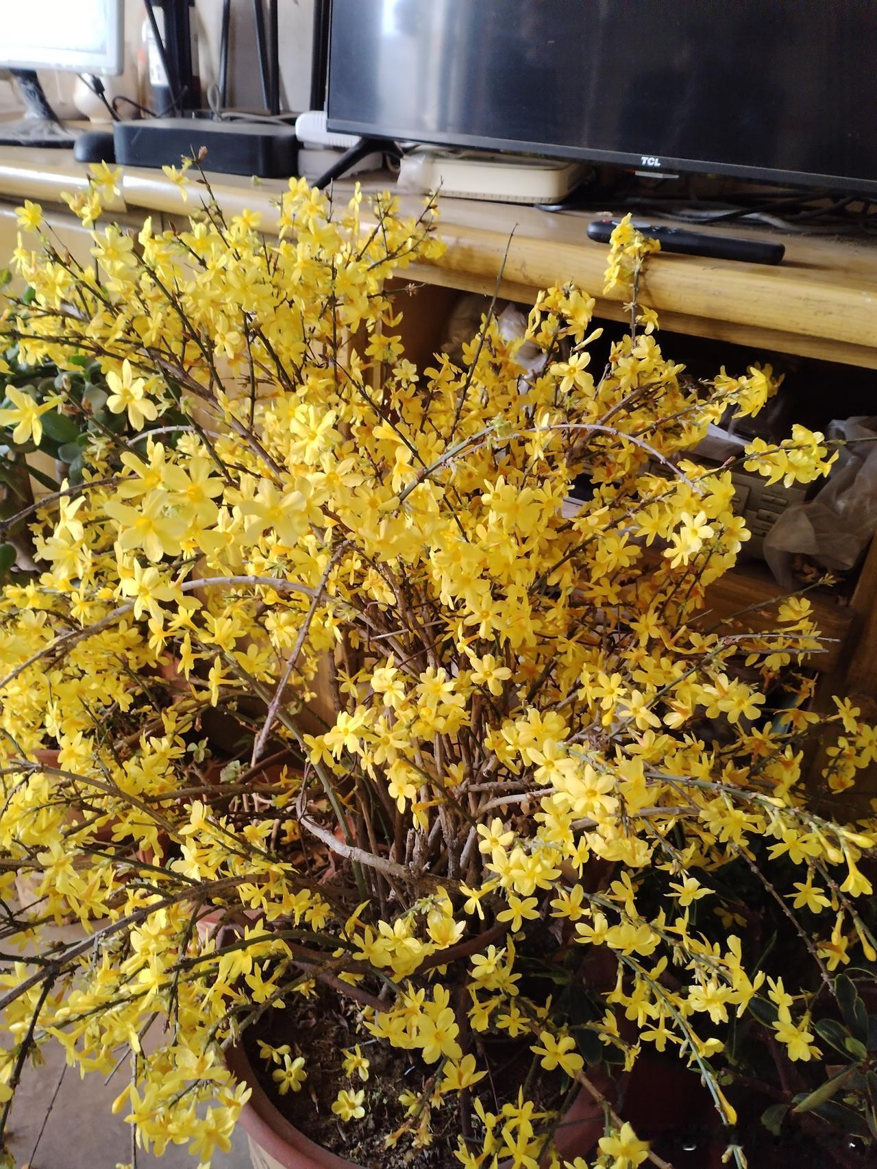 这盆迎春花一开! 感觉整个冬天的沉闷都被它给戳破了! 满盆的小黄花挤挤挨挨,像一群攒着劲儿要闹春的小娃娃,把光秃秃的枝桠都给裹得金灿灿的。 凑近了闻,还有点淡淡的甜香,不扎眼,却勾人。 我妈说这花是去年开春栽的,当时就几根细枝,没想到今年能开得这么热闹。 它也不挑地方,就摆在电视柜旁边,电视开着的时候,屏幕的光落在花瓣上,黄得更透亮了; 关了电视,它又像一盏盏小灯,把屋里照得暖融融的。 看着这些花,就觉得日子也跟着有了盼头。 冬天再冷,总有花先醒过来,把春天的消息捎给我们。 就像这盆迎春,没什么名贵的品种,却用最朴素的黄,把日子过得热热闹闹的。