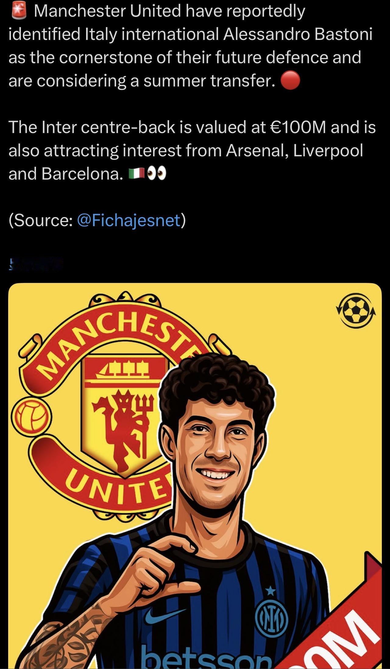 意大利球队缺钱,相互转会根本带来不了最大价值。 最好的办法就是:曼联这样的地主家傻儿子,花大价钱买去。然后用个1年半载,低价卖回去。 这样意甲球队,又赚到钱,又买到了人[呲牙] ……………………………………………………………… 据报道,曼联已将意大利国脚亚历山德罗·巴斯托尼视为未来防线的基石,并正在考虑今夏转会。 🔴 国际米兰的中后卫身价€ 1亿英镑,也吸引了阿森纳、利物浦和巴塞罗那的兴趣。
