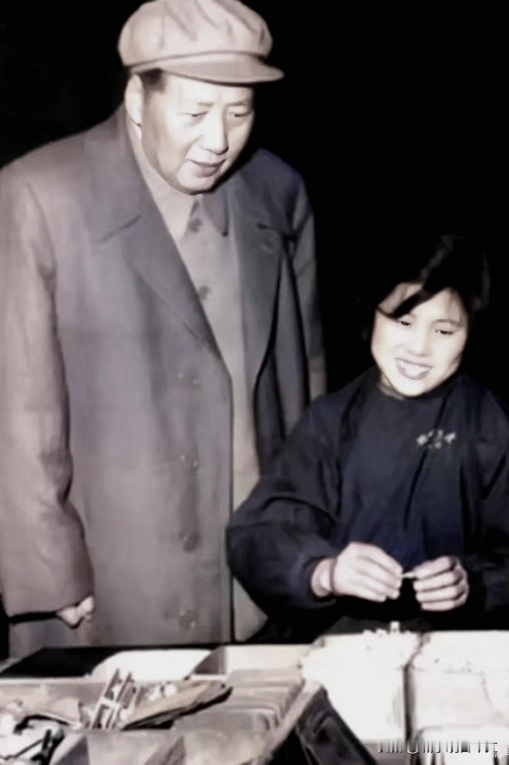 这是一张拍摄于1958年2月的老照片,毛主席在视察沈阳小型开关厂期间,和装配女工苏玉春亲切地交谈,毛主席用带着湖南口音的普通话询问苏玉春的工作情况。随行记者按动照相机快门,拍下了这张珍贵的照片。在小型开关厂视察的时间虽然短暂,但是毛主席对厂子的关心,使得每一位工人都倍受鼓舞。