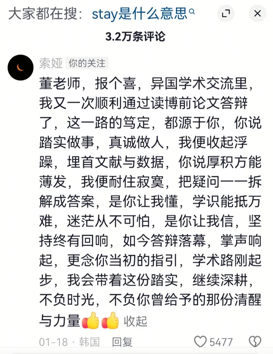 32岁的董宇辉,因为一个女孩又上了热搜,过年这几天,一个叫索娅的女孩,她趁着过年,在董宇辉发的视频下面连着留言,夸他性格好、人善良,话里话外都是对董宇辉的喜欢。 这事儿一出,董宇辉的粉丝群就分成了两派,有人觉得,姑娘家这么直接,是不是有点太主动了? 但也有不少人给她打气,说喜欢就该大声说出来,董宇辉平时工作忙,生活圈子简单,就需要这样热情主动的人去温暖他。 这个索娅条件不错,还是个博士又懂文学,跟董宇辉应该能聊到一块儿去,都是年轻人,大大方方追求幸福,没什么不好的,要是他俩真能成,那也是一桩美事。