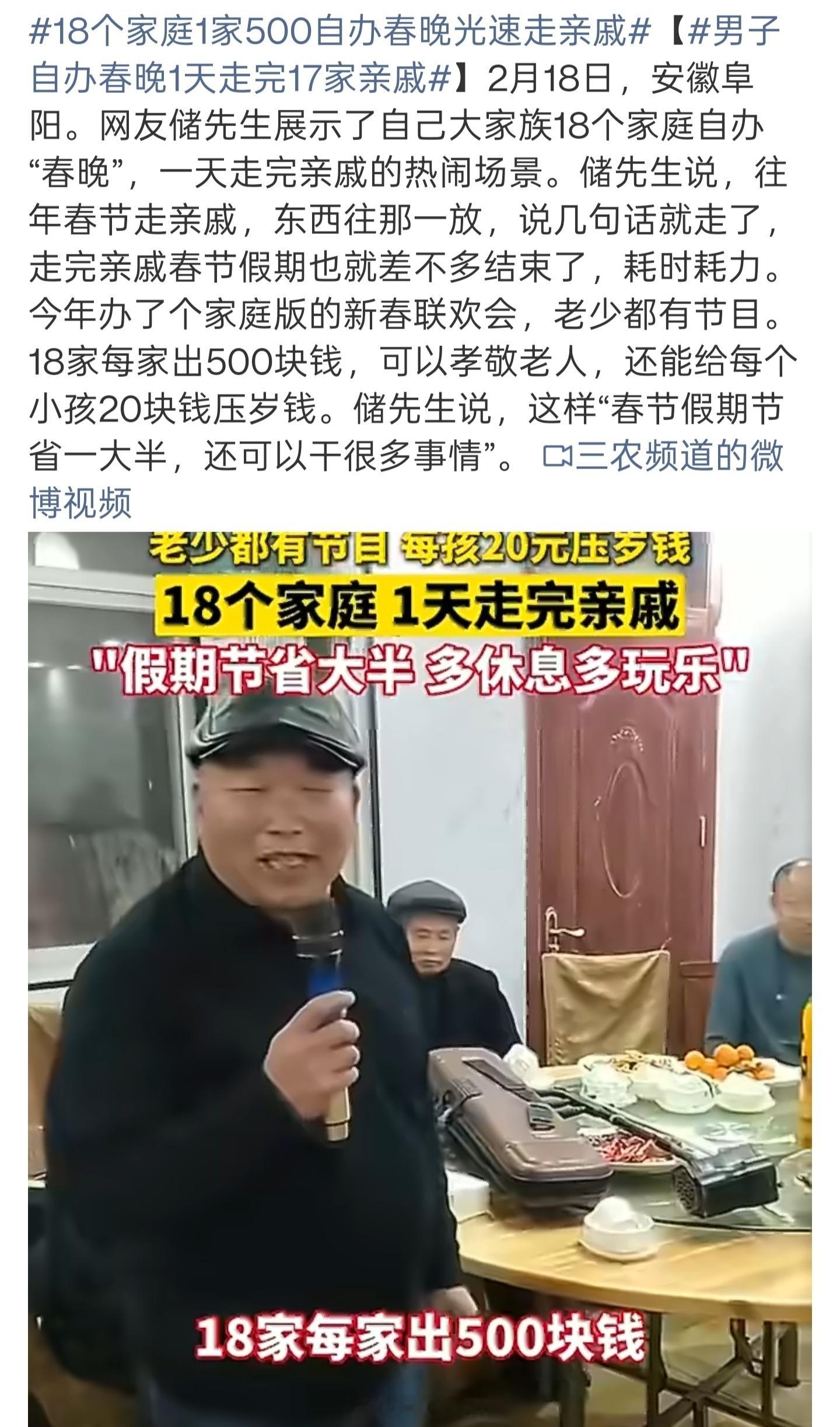 男子自办春晚1天走完17家亲戚真的牛犇,天才想法真的省时省力。我从小到大跟家里都是初一加初二的上午出门拜年,初三去姥姥家,雷打不动。
