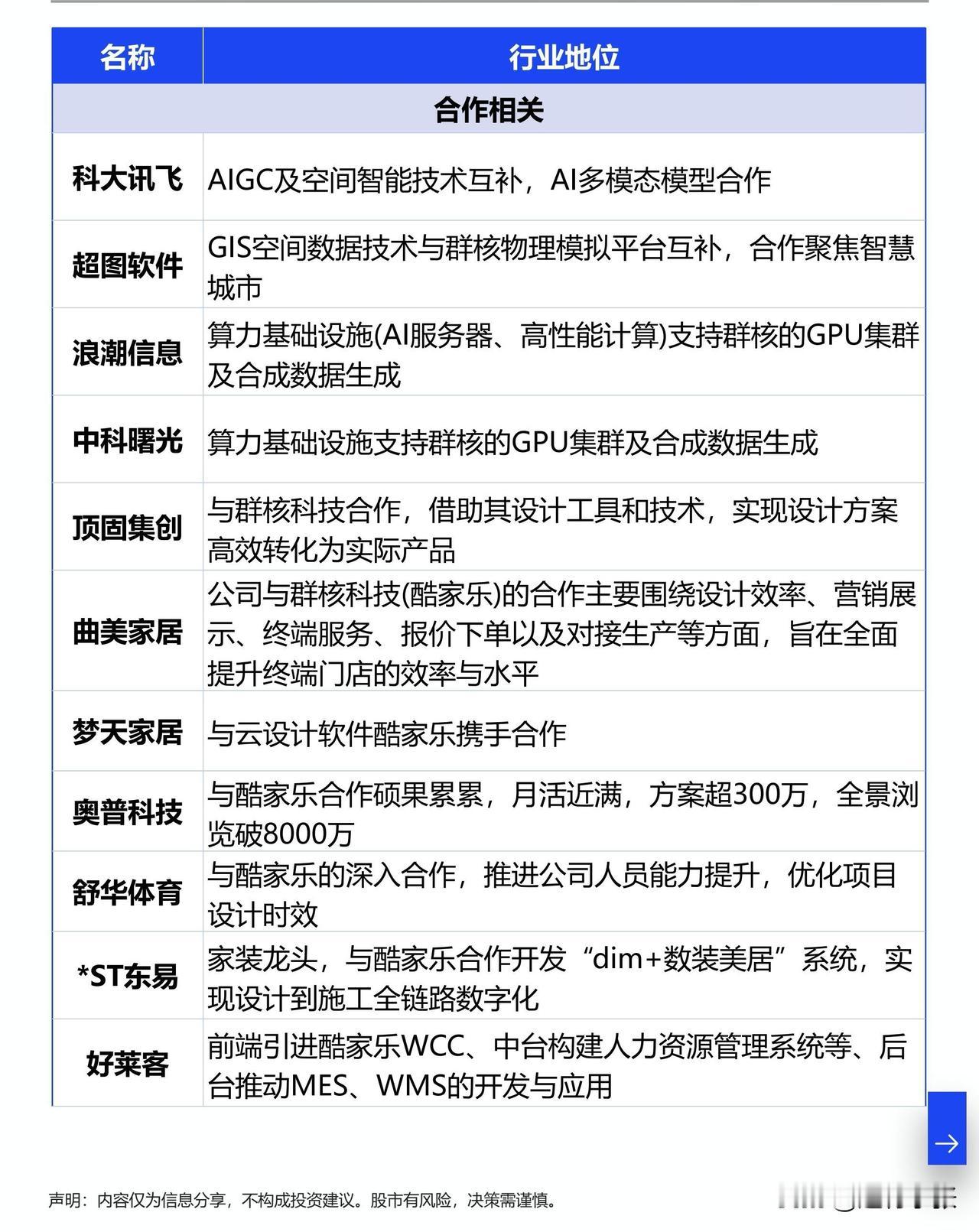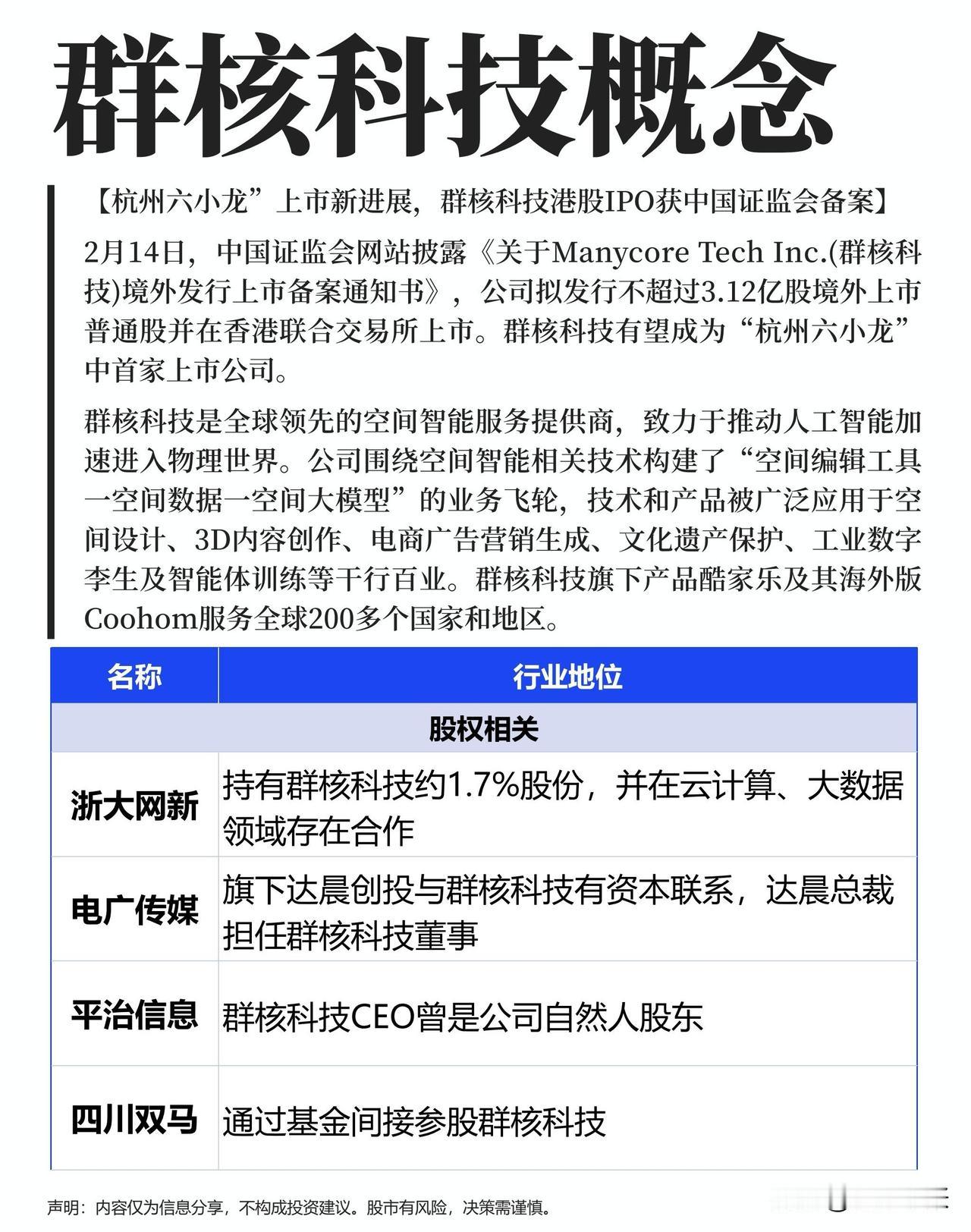 “杭州六小龙”首单IPO要来了! 群核科技港股上市获备案,空间智能龙头即将登陆资本市场。这家全球领先的空间智能服务商,旗下酷家乐服务全球200+国家,已构建起“空间编辑工具—空间数据—空间大模型”的业务飞轮,覆盖空间设计、3D创作、工业数字孪生等多赛道。 从股权关联到业务合作,A股多家公司已深度绑定:浙大网新、电广传媒等直接或间接持股;科大讯飞、超图软件、浪潮信息等在AI、算力、GIS领域技术互补;曲美家居、梦天家居、奥普科技等则借助酷家乐实现家装数字化升级。随着IPO推进,空间智能赛道的资本热度有望持续升温,相关产业链公司或将迎来价值重估。 注:内容仅为信息分享,不构成投资建议,股市有风险,决策需谨慎。
