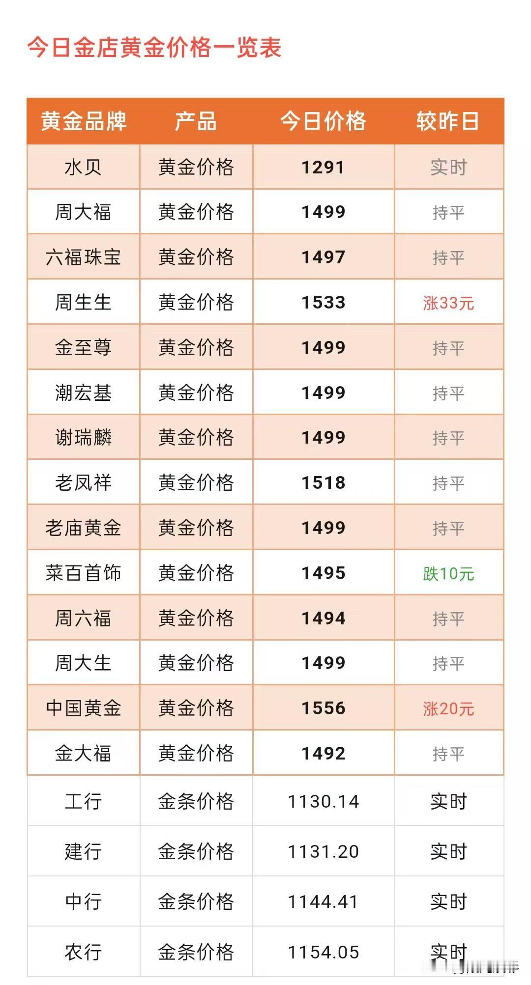 黄金报价!各大品牌黄金门店金饰品报价!以及黄金风险提示! 今天(2026年2月20日)星期五,中午12点04分。 那么来看看,各大品牌黄金门店金饰品价格零售价卖到多少钱一克了? 周大福黄金价格1499元/克,六福珠宝黄金价格1497元/克,周生生黄金价格1533元/克,老凤祥黄金价格1518元/克,老庙黄金黄金价格1499元/克,菜百首饰黄金价格1495元/克。 同昨天(2月19日)各大黄金门店金饰品报价相比较,今天有两个品牌黄金门店金饰品价格上涨了。 另外,有一个黄金门店金饰品价格下跌了。 那我们来看看,上涨的是哪两个品牌黄金门店? 周生生上涨了33元/克,中国黄金上涨了20元/克。 来看看,下跌的是哪一个品牌黄金门店? 菜百首饰下跌了10元/克。 另外,周大福、六福珠宝、金至尊、潮宏基、谢瑞麟、老凤祥、老庙黄金、周六福、周大生、金大福同昨天金饰品报价保持一致。 根据黄金价格网消息: 2026年2月20日亚市,受到中东地缘紧张局势,金价小幅上涨,现货黄金交投于5000美元附近,关注今晚即将公布的美国GDP、PCE及PMI数据,以对美联储政策路径的影响。 截至10时50分黄金实时行情:伦敦现货黄金报每盎司4996美元,美黄金报每盎司5013美元,伦敦现货白银报每盎司77.9美元,美白银报每盎司77.9美元。 国内实时金价1107元/克,白银实时价格19.3元/克,铂金实时价格465元/克。 有关建行金点网消息: 美伊局势持续,贵金属持稳震荡,现货黄金连续第二个交易日上涨,盘中最高触及5022.25,最终收涨0.42%; 现货白银升至一周新高,最终收涨1.70%。19日国际市场金银铂报5000.22、78.55、2079.90美元/盎司,或1109.76、17.43、461.62元/克,金银比价为63.66。 风险提示:近期黄金市场波动加剧,请投资者注意市场风险,理性投资。 来分享个购买黄金饰品注意5要点,买金不踩坑。 1: 不必执着大品牌。足金首饰不一定非选大品牌,只要是足金小品牌或普通金店也可以,款式差异不大,还能省不少钱,毕竟大品牌金价和工费偏高。 2: 认准足金标识。买的时候别只看款式,一定要看钢印标有AU 999、G999和足金999的才是足金指标,不用追求4个9、5个9的纯度,回收时和3个九的价格一样。 3: 按克购买更划算。黄金要按克卖,别买一口价,单价高,后续货款只能换一口价款式,可能还要补钱,再优惠也不划算。 4: 慎选带附加饰品的款式。带玉石、珍珠、钻石的黄金款式尽量不买,这些附加饰品容易掉且不值钱,金价可能拉高,专坑不懂行的。 另外,耳钉选弯针不选直针,项链选M扣不选弹簧扣,手镯不选搭扣款和镂空开口款,这些非足金部分也会按足金计价。 5: 提前了解实时金价,上网查一下黄金走势,各品牌和银行的当日金价,做到心里有底。 还有,金店可以砍价,店员可能有内部优惠或员工折扣,你得主动提出要求,不然他们不会主动说,毕竟多买多赚。 记住这几点,买黄金首饰就不会吃亏。 再来分享个黄金首饰保存的方法: 1: 单独存放:用首饰盒里的小格子或独立密封袋分开装,避免和其他饰品摩擦,也能防潮湿。 2: 环境干燥:别放在浴室、厨房等潮湿地方,可在首饰盒里放一小包干燥剂,防止黄金氧化受潮。 3: 长期不戴:先用软布擦干净再存放,避免表面留汗渍或污垢,否则放久了可能暗沉。 另外,如果发现黄金表面有轻微发黑,别自己用硬物刮,先试试温和清洁,要是氧化严重或有磨损,直接找品牌售后,他们有专业翻新服务,能恢复光泽。 以上,所有信息,都只是提供参考价值! 购买黄金有风险,投资需要谨慎,不要盲目跟风! 黄金售卖价格 黄金价 黄金一克720 黄金金店价格 足金金饰价格 金饰价 周生生的金价金价行情 金价回收行情 实时金价 黄金售卖价格 黄金一克720 黄金金店价格 足金金饰价格