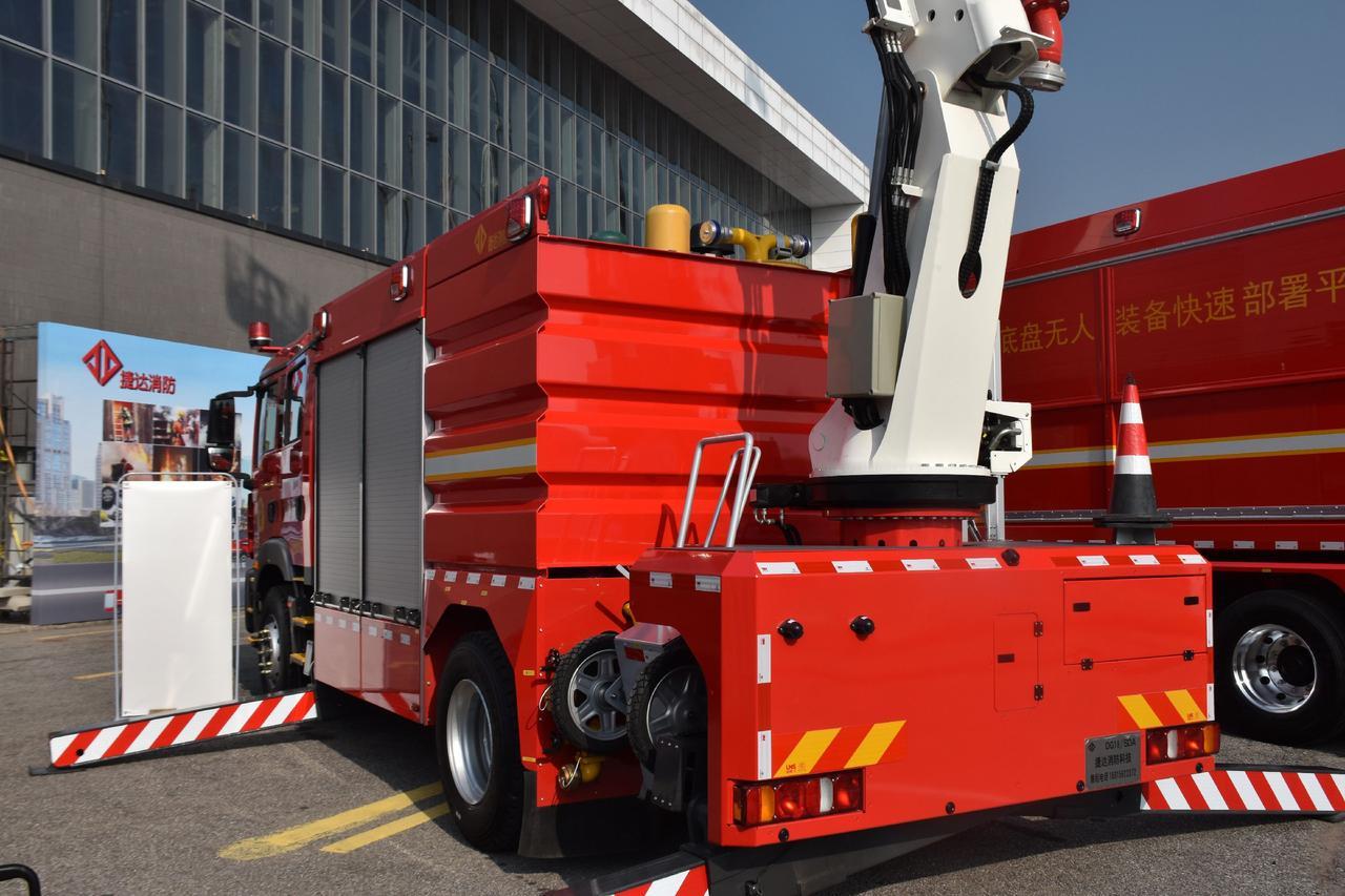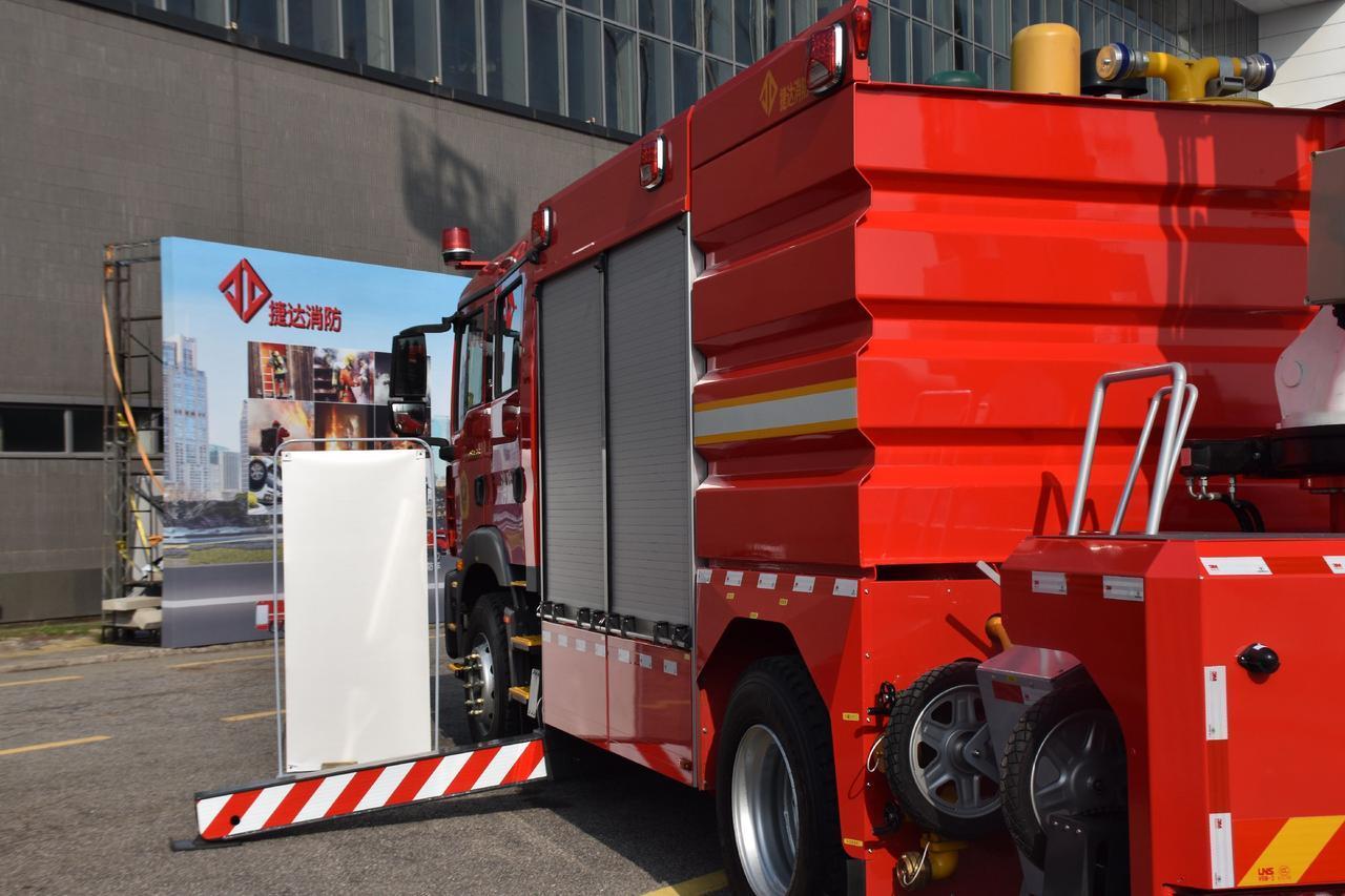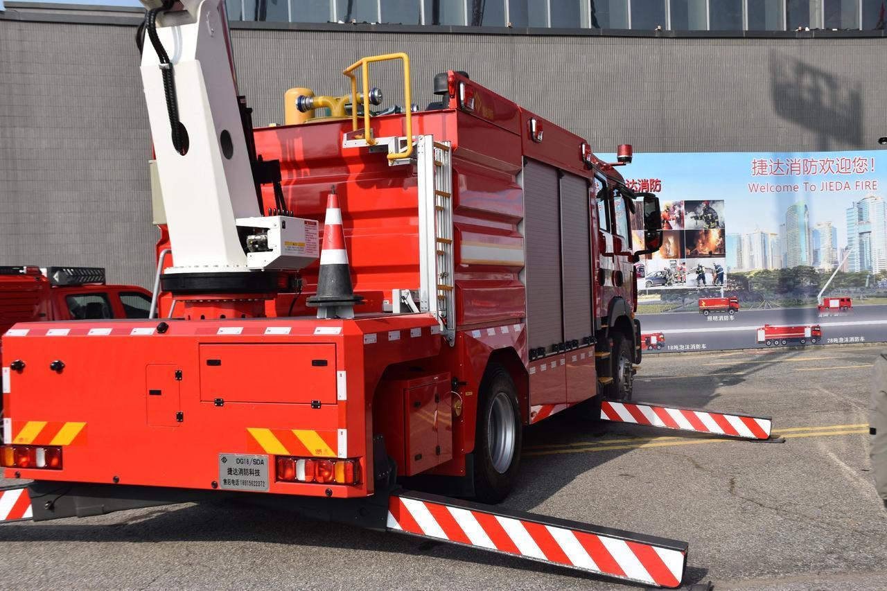 捷达DG18登高平台消防车(三功能)可以选装国产或进口底盘; 双排驾驶室或单排+独立乘员室,座位设置:2+4人 适用范围: 按照《“十四五”国家消防工作规划》,围绕”全灾种”应急救援攻坚能力建设需求,整合优势资源,减少重复投入浪费,集中力量开展科技攻关,研发通用化、系列化、模块化的新一代高端主战装备要求,而全新开发符合”全灾种、大应急、大救援”要求的“三功能”主战消防车。 这台车集登高、救援、灭火功能于一体的综合型消防车;功能高度集成,同时到场、结合场景相互协同作战。 可选双排座或单排+独立乘员室结构 驾乘室内可进行穿戴战斗服,快速出动,可节省20~30秒出警时间。 多功能臂架---集成照明、登高平台、高喷与一身。 高空施救,安装18米救援工作斗,快速展开、高空救援。 重型器材抽屉,放置金属切割机、油锯、波压撬门器、液压剪切扩张两用钳等。 重型器材拖架,放置发电机、手抬泵、排烟机、救援破拆工具组等。 按战斗编成和战斗展开设计器材集成;按人体工程学原理设计各种器材托架;按使用逻辑关系和使用频率放置器材; 站在地面或踏板上1~2个动作内取用任何器材。上车前配置快速救援牵引装置。 上车型配有大容量灭火剂,配置水和泡沫液; 上双级叶轮消防泵,中常压无需转换,直接采用发动机转速调节泵性能,满足举高喷射消防车,高层高压灭火作战需求,减少动作时间,提高高喷射程。 一配置水带提盒,每盒内存放3寸水带40米,可快速完成楼梯通道、地下室的水带铺设。 人配置水带推车。水带推车可将消防水带、包布、分流器、水合等合理的放置在车内,一站式运输,”便于远距离败设,灵活机动,目减轻了作业强度,提高灭火效能。