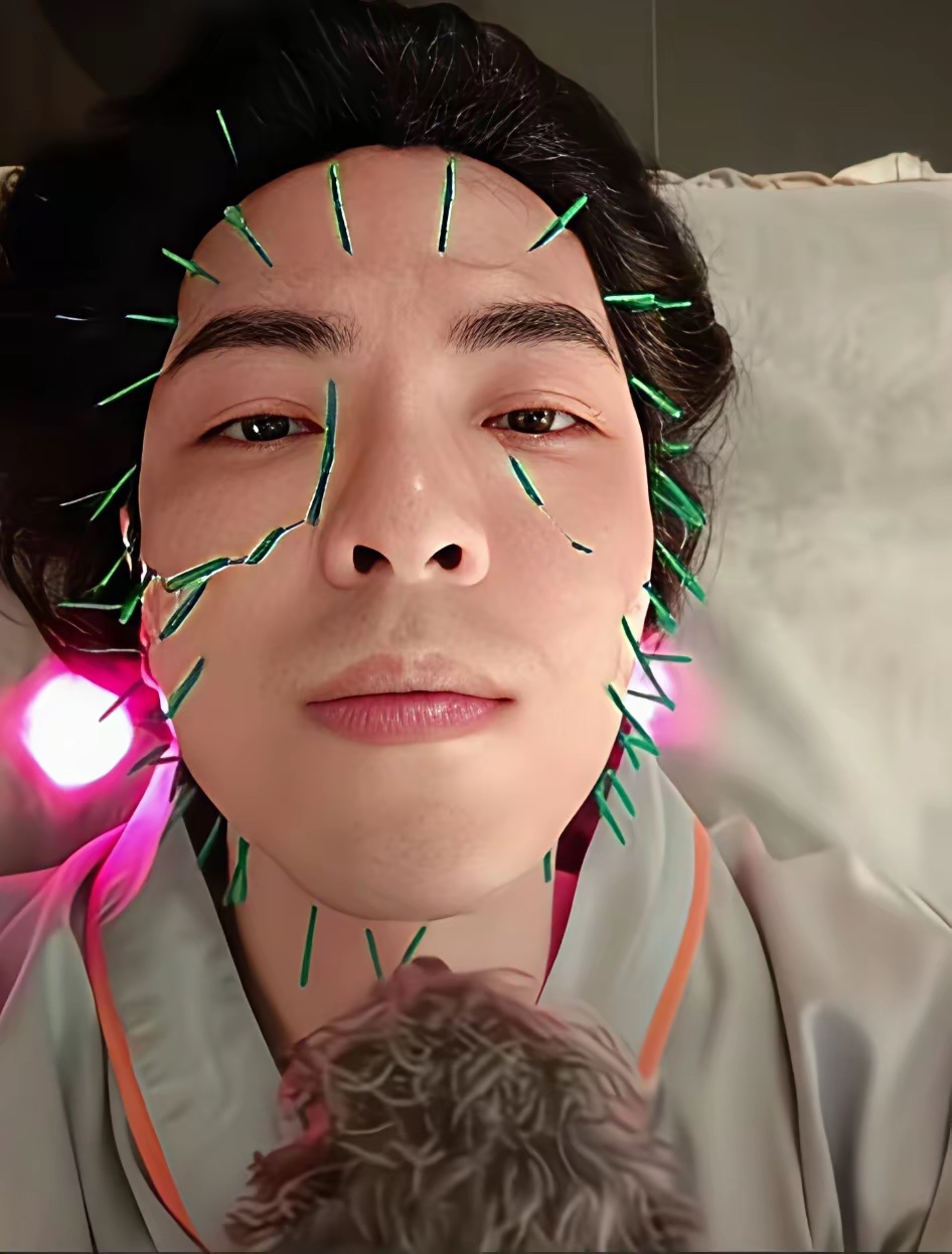 萧敬腾真是个宠妻狂魔!老婆针灸他也陪,不惜脸上扎满针!夫妻同心真不易!哪位友友能说清?为什么扎的是绿色的针?