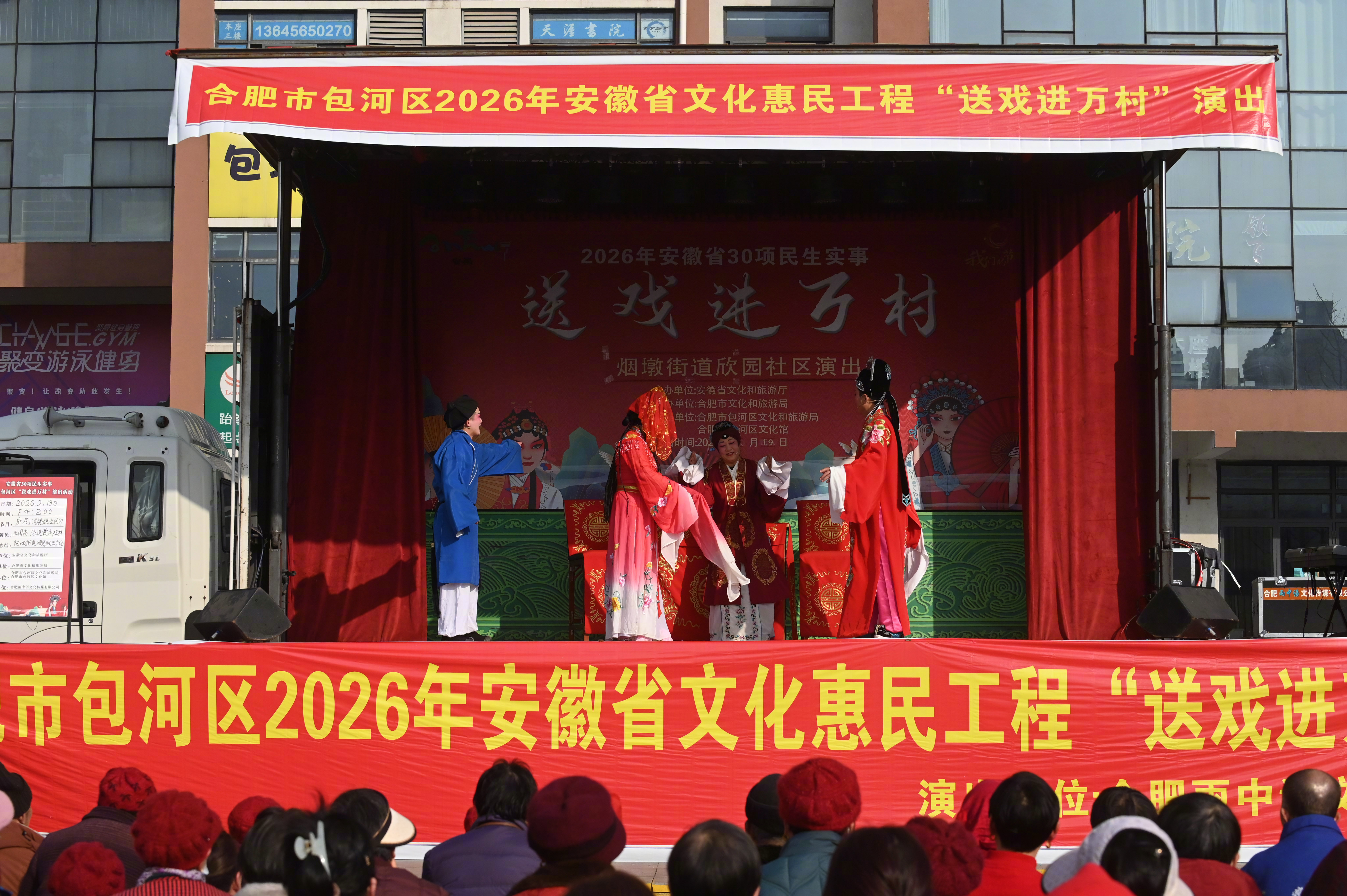 #2026新春走基层#【#家门口看戏感受别样年味#】2月19日,伴随着铿锵的锣鼓声和悠扬的琴声,2026年合肥市包河区“送戏进万村”首场演出在烟墩街道欣园社区热闹开锣。