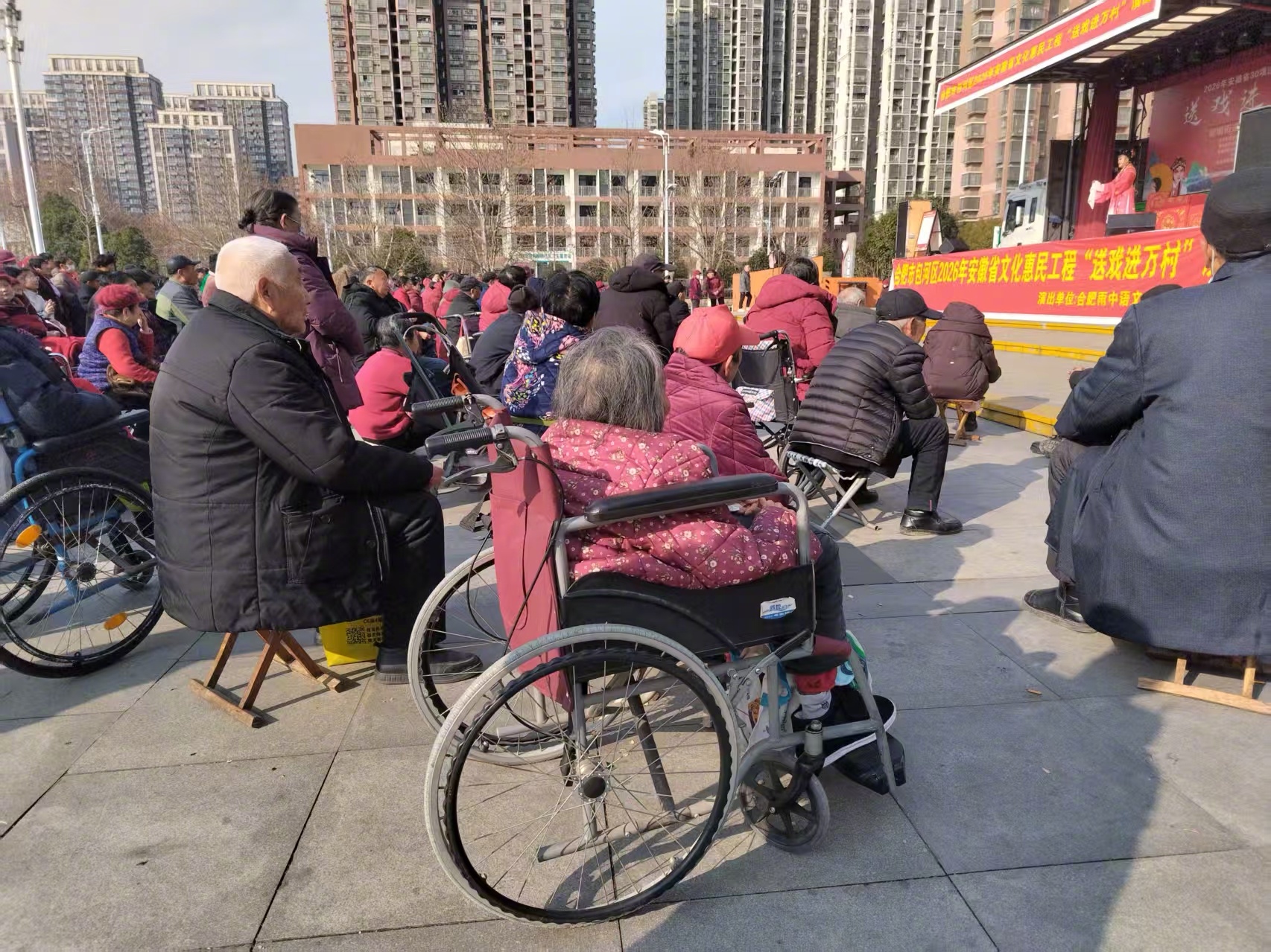 “我听说今天唱的是庐剧《婆媳之间》,这戏接地气,讲的都是家长里短的事,不听可惜了!”今年90多岁的许奶奶腿脚不便,坚持让儿子推着轮椅送她来,“从小爱听戏,就跟过年吃饺子一样,不听一场,总觉得年没过完”。