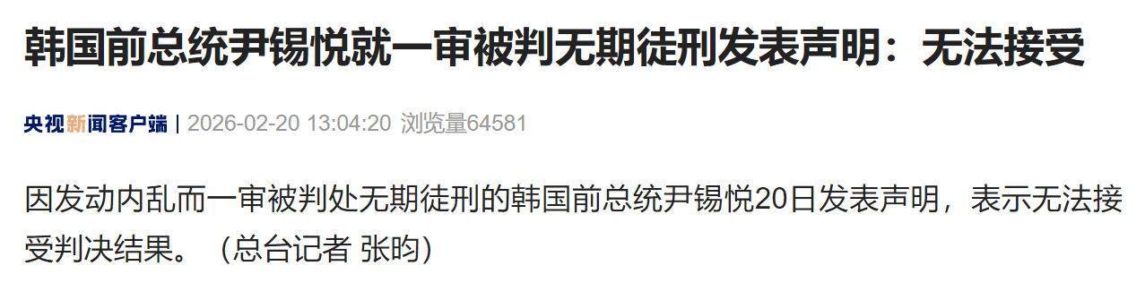 【#尹锡悦回应一审被判无期徒刑#】因发动内乱而一审被判处无期徒刑的韩国前总统尹锡悦20日发表声明,表示无法接受判决结果。(央视新闻)