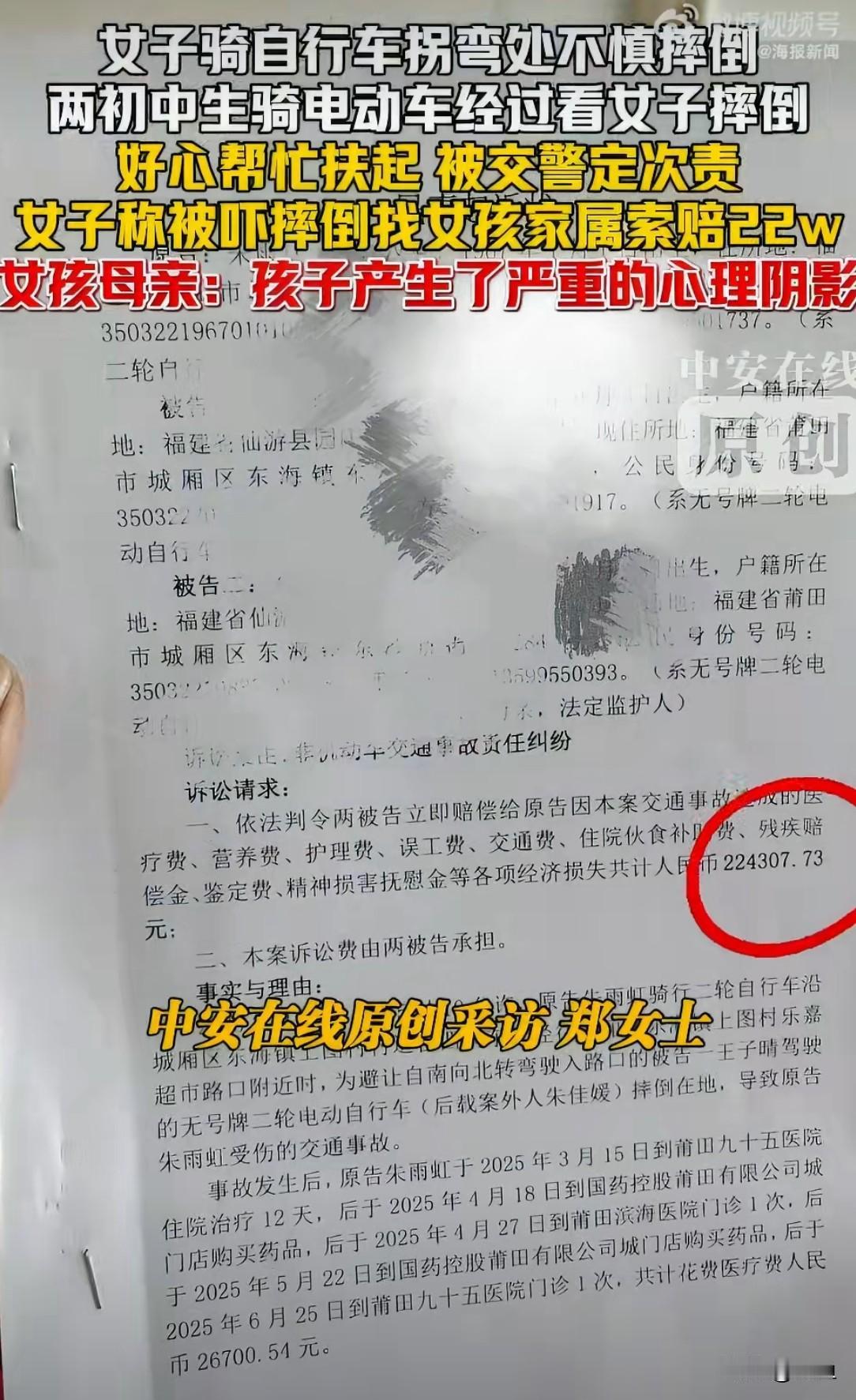 现在的世道,扶个老人真需要莫大的勇气。 近几日俩初中生扶人的事闹得挺大,本以为是见义勇为,结果反倒成了被告,还得赔钱。 大伙先别急着喷老太太,这事儿背后其实藏着个挺扎心的细节。 据说这俩孩子还没满16岁,就私自骑着电动车上了路。 老太太那边一口咬定,是看见孩子骑车冲过来,自己受了惊吓才摔倒的。 在交警那儿,这可能被定性为“非接触性事故”,只要你违规骑车在先,这责恐怕就难逃了。 我觉得这事儿真挺让人纠结。 如果孩子离得远,老太太这操作纯属是在寒善良人的心。 可要是真是违规骑车惊着了人,法律确实不怎么跟你讲“顺便扶一下”的情分。 这下咱们可算是看清了,原本的一桩好事,因为违规骑车变得这么复杂。 现在案子已经闹到了法院,大伙都在等一个公道的说法。 既别让好心人吃了哑巴亏,也得让孩子们明白,规则这东西真不是摆设。