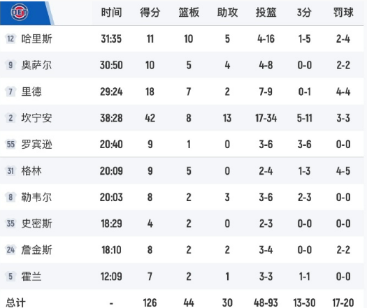 坎宁安天神下凡,暴砍42分8篮板13助攻,率领活塞126-111客场战胜尼克斯,取得四连胜,战绩超越雷霆,来到联盟第一。