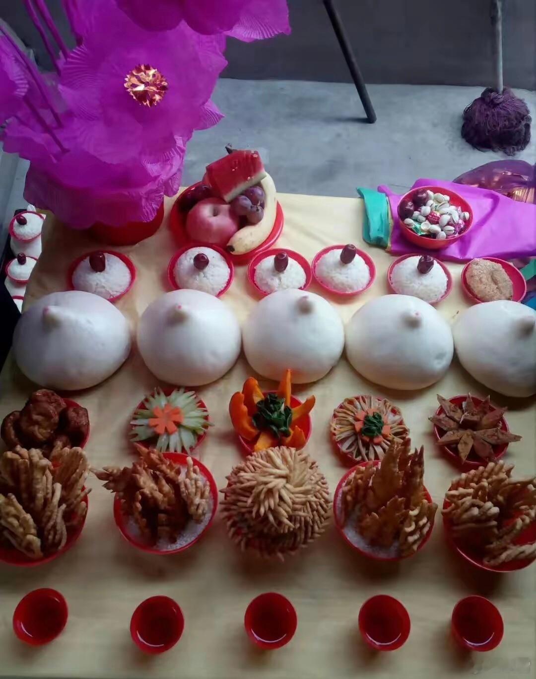 比如山西五台山,今天宜盖房子或动迁,之后中要谢土,意是动了土,怕惊扰了此地的众位神明,这个仪式就是谢土。摆的供品,包括图中的花,都需要自己动手。