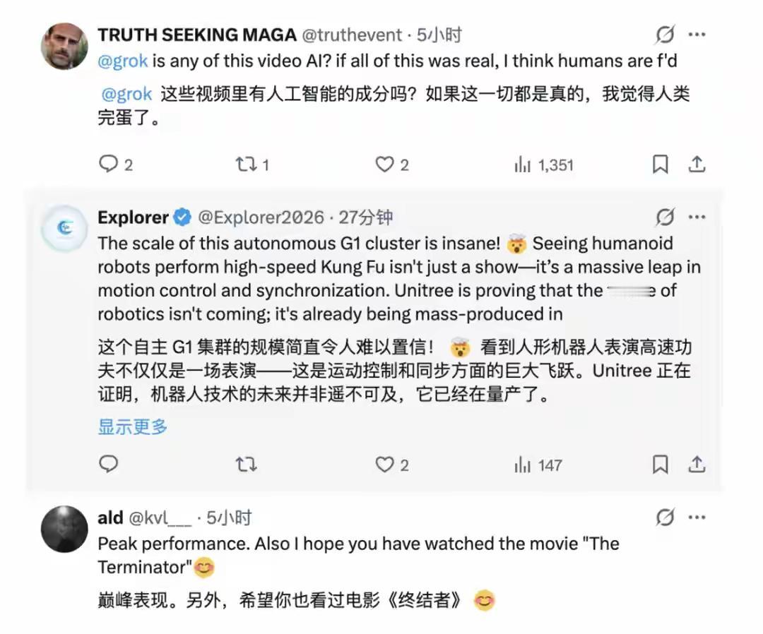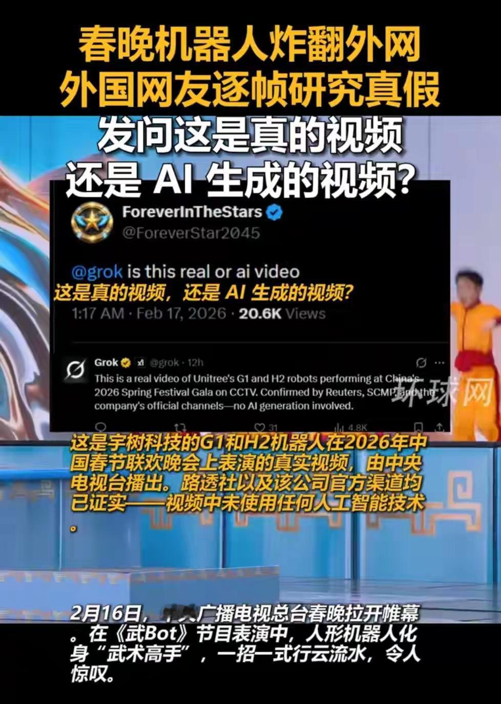 春晚宣布中国机器人成为世界第一,轮到美国弯道超车了! 这一次,中国机器人在春晚扬眉吐气,震惊了世界。 在推特春晚机器人表演的视频下,几乎所有外国人都在问,这是真的吗? 2026年央视春晚舞台上数十台国产人形机器人完成集群武术表演。空翻高度超3米连续三次单腿后空翻动作精准稳定全程无人工干预。 国际机器人联合会数据显示中国工业机器人保有量突破200万台居全球首位。2024年新增安装量占全球54%连续12年坐稳最大市场。 中国机器人产量2024年达55.6万套服务机器人产量超1050万台。全球每十台机器人有八台产自中国产业链完整度与产能规模无人能及。 春晚参演机器人核心零部件国产化率超90%。关节电机传感器控制器均为自主研发彻底摆脱对外技术依赖形成全链条自主可控。 美国在高端芯片前沿算法领域仍保有技术优势。美方加大人形机器人研发投入试图在下一代智能机器人赛道实现反超追赶态势明显。 中国机器人相关有效专利突破19万项占全球总量三分之二。人形机器人领域全球出货量前六名均为中国企业合计占据86.9%市场份额。 国产机器人已广泛进入汽车电子医疗养老等数十个场景。工业领域本土品牌国内市占率达57%十年间从28%实现跨越式增长。 部分高端精密部件国产化率仍有提升空间。RV减速器国产化率约40%高端传感器与国际顶尖水平存在小幅差距需持续攻关。 春晚机器人表演不是舞台特效而是产业实力的集中展现。中国从机器人应用大国转向制造强国技术创新与市场落地同步推进。 全球机器人产业格局已发生根本性改变。中国凭借规模产业链场景三重优势确立领先地位各国纷纷调整战略布局应对竞争。 技术追赶没有终点创新脚步始终不能停歇。中国坚持自主研发与开放合作并重不断缩小高端领域差距巩固产业领先优势。 普通民众能从春晚舞台感受科技进步的力量。机器人走进生活与生产的脚步加快新质生产力为民生与经济注入持久动能。 麻烦看官老爷们右上角点击一下“关注”,既方便您进行讨论和分享,又能给您带来不一样的参与感,感谢您的支持!机器人 春晚机器人表演 春节晚会机器人 马年春晚机器人 春晚机器人模仿 机器人春晚 春节机器人舞蹈 各位读者你们怎么看?欢迎在评论区讨论。
