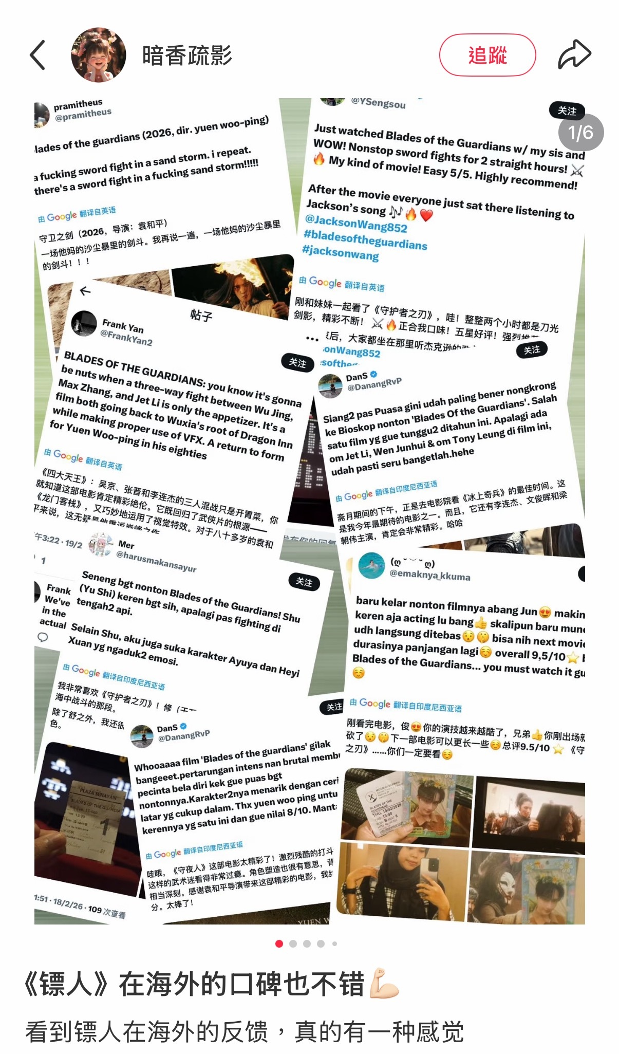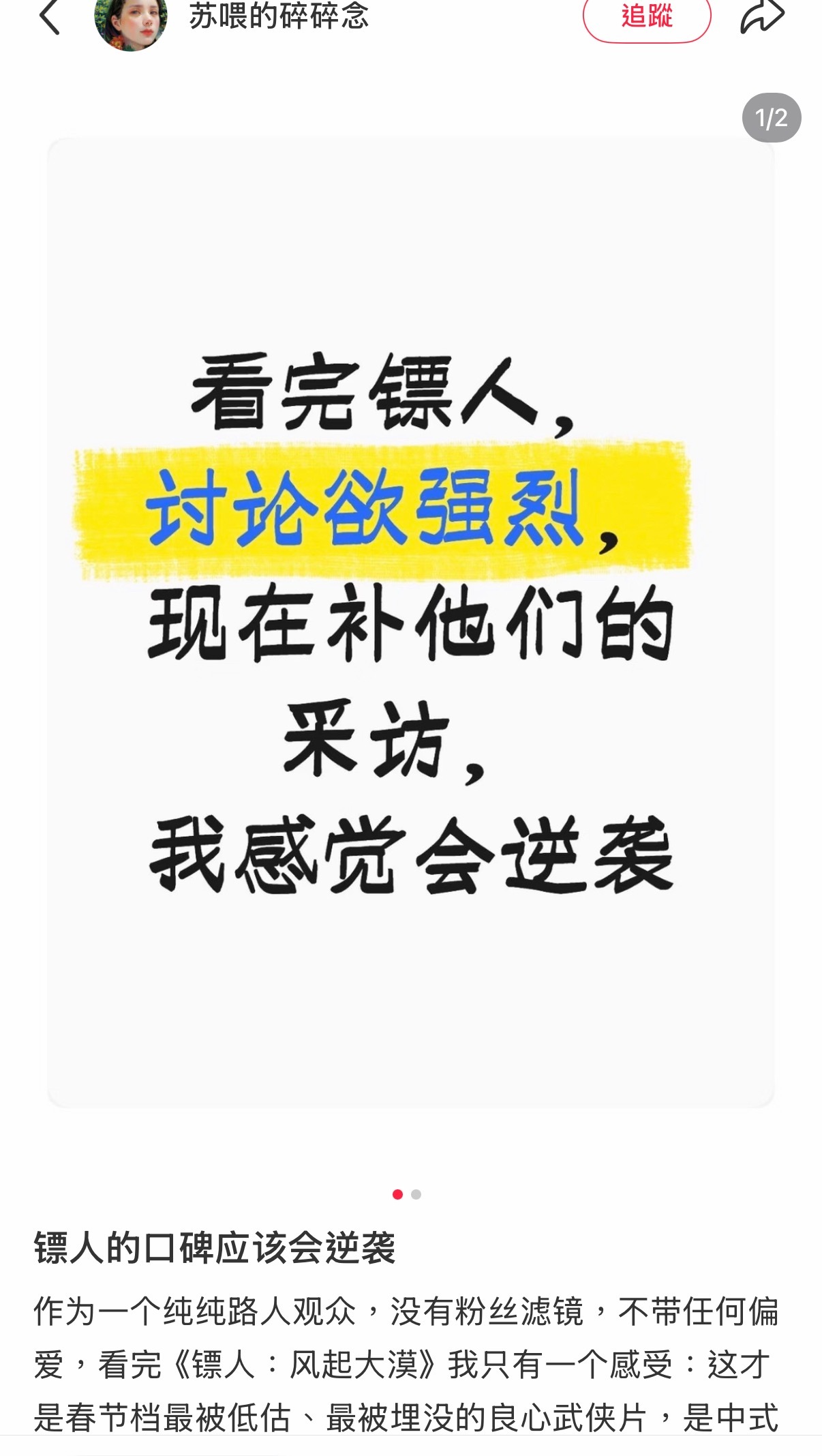 属于镖人的春节档才刚刚开始《镖人》口碑开始逆袭了!!久违的武侠味道!打戏完全酣畅淋漓,加上那个音效配合,视听方面真的爽飞了!不想赘言,不想剧透,但真的好喜欢主角团啊!!我愿化身镖人胫骨,强烈呼吁镖人第二部!镖人给我冲!