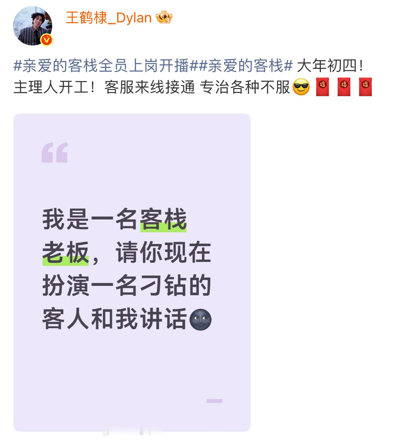 王鹤棣大年初四开工王鹤棣大年初四开工营业,专治各种不服,期待住了!