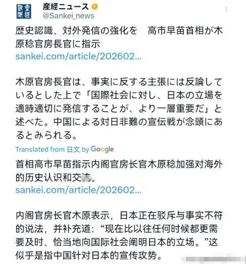 不接受中国的做法,日本再次作出表态! 2月19日,根据产经新闻报道,日本内阁官房长官木原稔在19日的记者会上声称,首相高市早苗指示他在第二届内阁就职后,要加强在领土问题和历史认知方面的沟通。内阁正在驳斥与事实不符的说法,现在更需要及时、恰当地向国际社会阐明日本的立场。 说白了,小日子这是好了伤疤忘了疼,一边靠着我们中国赚得盆满钵满,一边还敢摆架子、放狠话,明着暗着跟我们作对,我们要是再放松管控,迟早要吃大亏! 2月19日,产经新闻的报道一出来,不少人都看清了日本的真面目,内阁官房长官木原稔在记者会上那番表态,看似是要“阐明立场”,说白了就是不接受中国的相关做法,还想在领土和历史问题上狡辩,真的太嚣张了。 大家一定要记住一句话,一只狼,如果一次没有打死它,等它恢复了身体素质和元气以后,这只狼一定会回来疯狂报复,甚至搞得鸡犬不留。 日本这几年的操作,完美印证了这句话,我们一直以包容的心态对待中日经贸合作,可他们却把这份包容当成了软弱,骨子里的野心从来就没藏住过。 而且我发现,小日子是真的不怕,一点慌乱的样子都没有,据说他们的日经225指数近期接连刷新历史新高,2月9号、10号两天就涨了三千多点,散户都在跟风入场,整个日本股市一片狂热,这种情况下,他们看我们的眼神里,全是藏不住的蔑视,半点收敛的意思都没有,我们绝对不能放松对他们的管控。 可能有人还没意识到,中国一直是日本资源的大后方,他们那个鸟国,说白了就是个资源贫瘠的地方,啥都缺,不管是工业所需的矿产,还是民生所需的各类资源,大多都要靠进口,而我们中国,就是他们最重要的资源来源地之一。 更让人警惕的是,日本如今的经济成就,说白了就是踩在我们肩膀上成长起来的。 这些年,他们在我们中国投资了不少大型超市、汽车企业和购物中心,靠着我们庞大的消费市场,赚走了我们中国人大量的钱,这些钱被他们的企业带回日本,上缴税款,而日本政府就拿着这些从中国赚来的税钱,疯狂扩充军队、研发武器。 我感觉,据说他们2025年度的防卫相关费用已经达到了约11万亿日元,还提前两年实现了防卫费占GDP2%的目标,明眼人都能看出来,他们这是在积蓄力量,意图再次侵略中国,我们国人真的不能掉以轻心。 木原稔在记者会上还说,高市早苗首相指示他,在第二届内阁就职后要加强领土和历史认知方面的沟通,还在驳斥所谓“与事实不符的说法”,这简直是颠倒黑白。 要知道,高市早苗内阁上台后,一直在推行积极的财政政策,还重点投资防卫产业,甚至有首相官邸人士主张日本拥核,这些举动都在暴露他们的野心。 更关键的是,据说近六成日企还计划今年扩大或维持对华投资,一边赚着中国的钱,一边拿着钱搞军备扩张,还敢不接受中国的做法,这种两面三刀的操作,真的太让人不齿了。 我们从来都不是怕事的人,但也绝对不会掉以轻心,对日本这样的国家,必须时刻保持警惕,不能给他们任何恢复元气、疯狂报复的机会。 不管他们的股市多红火,不管他们多嚣张,只要敢触碰我们的底线,我们就绝对不会惯着。 以上内容仅为我个人看法,不代表任何官方观点,每个人都有自己的解读和见解,欢迎大家在评论区留下你们的想法,一起聊聊自己的看法。