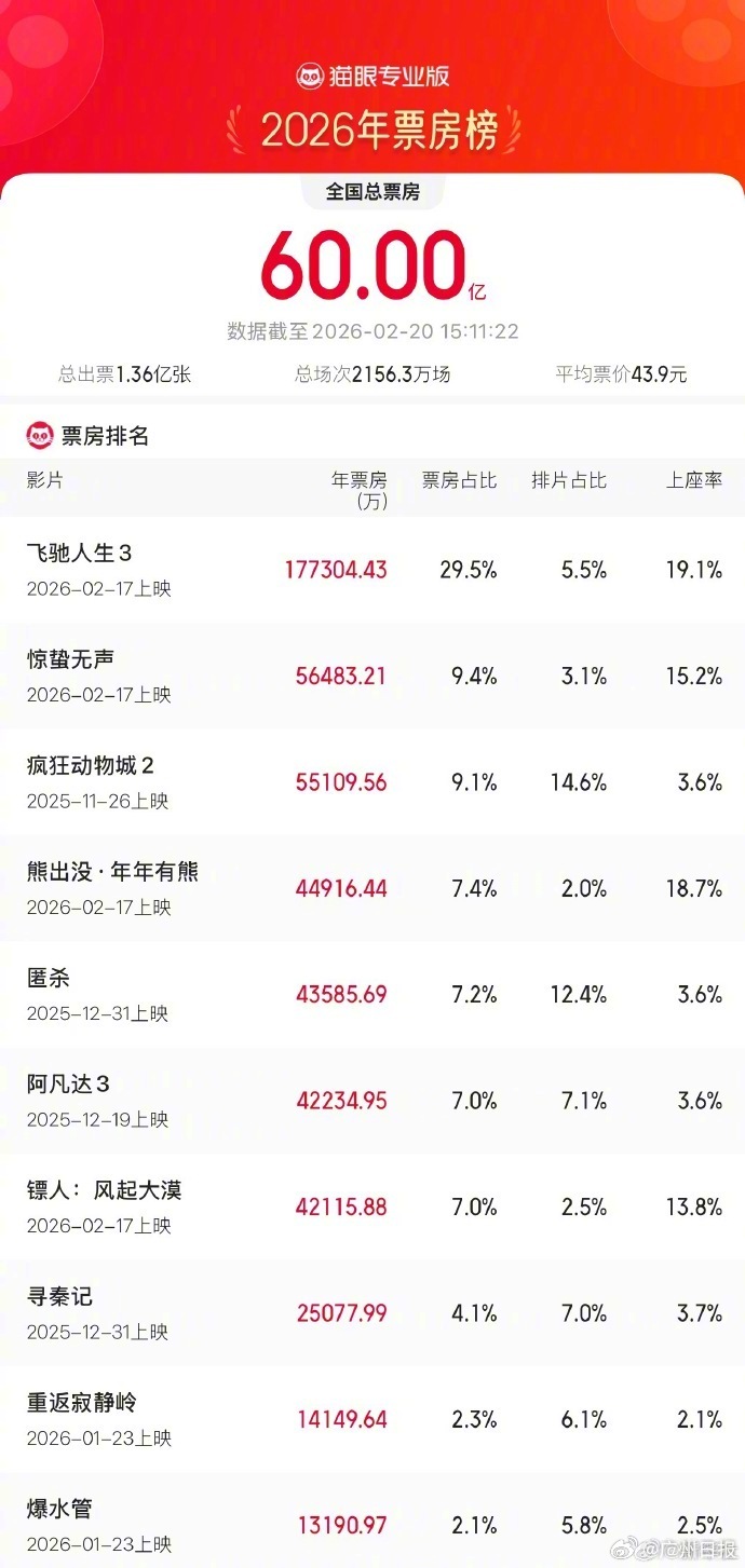 【#2026年度总票房已破60亿#】据网络平台数据,截至2月20日15时07分,2026年年度电影总票房(含预售)突破60亿!截至目前,春节档电影总票房(含预售)已突破34亿元。其中,《飞驰人生3》《惊蛰无声》《熊出没·年年有熊》位列前三。#马年春节档你最期待哪部#?《飞驰人生3》谢霆锋