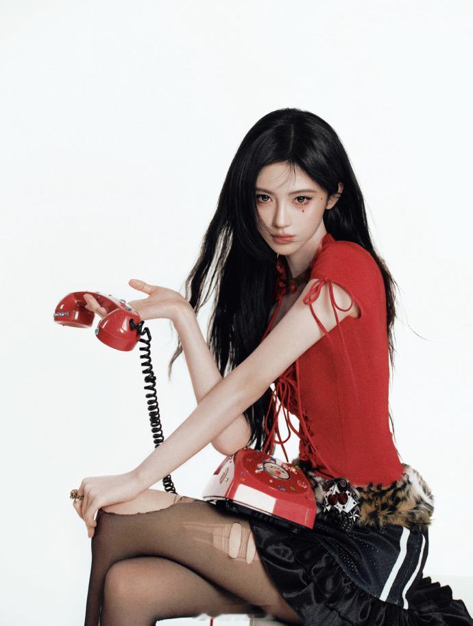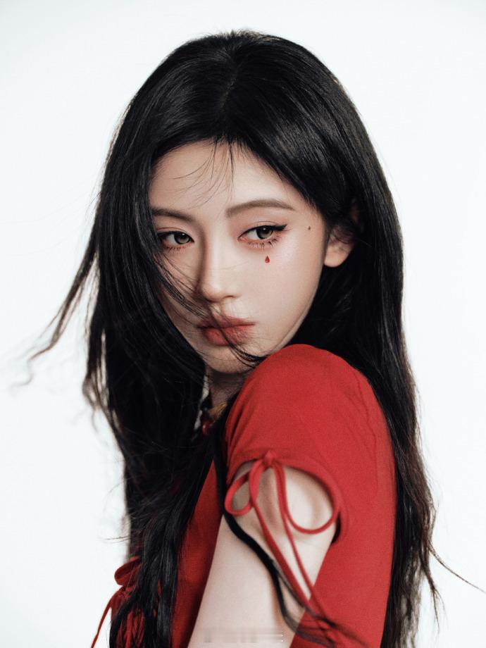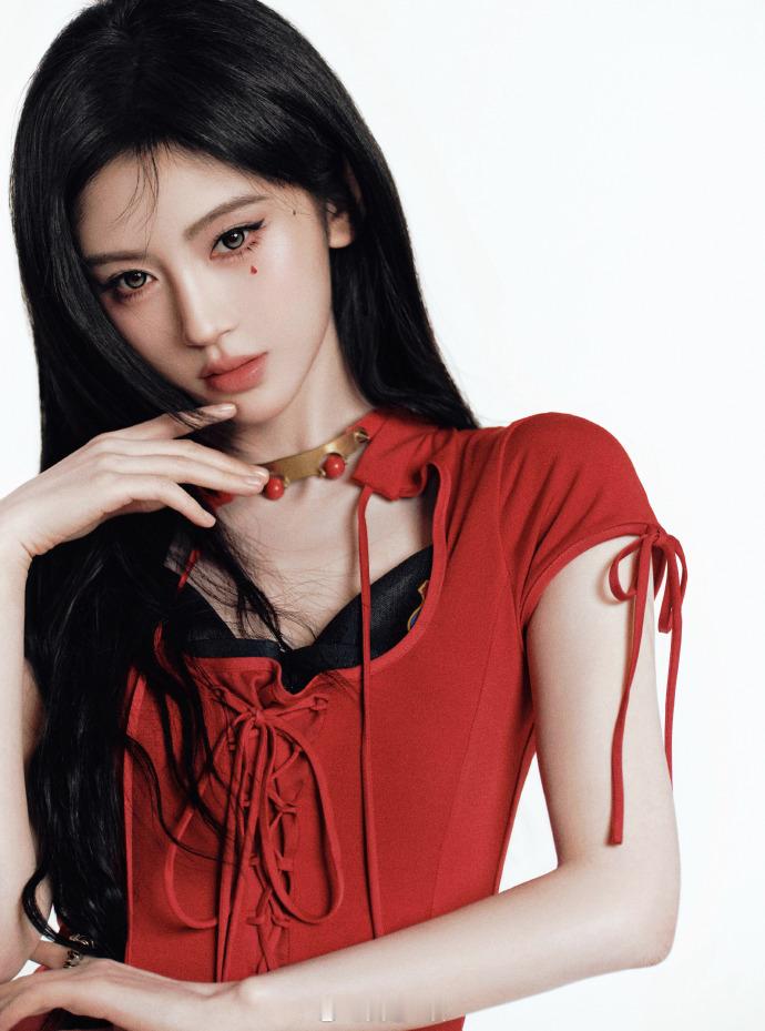 着红衣火辣酷飒、单手托腮气场拉满——鞠婧祎。每日明星美图分享