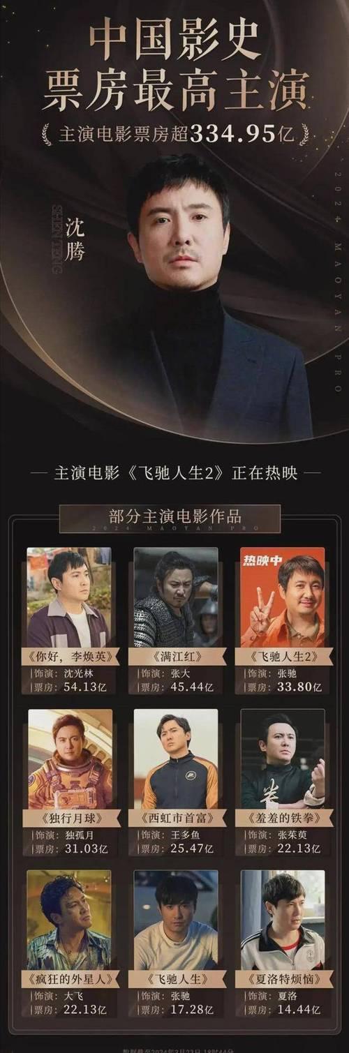 截至2026年2月20日,沈腾凭借385.83亿元主演票房,稳坐中国电影票房最高男主演宝座。春节档《飞驰人生3》持续热映,票房一路领跑,进一步拉大与第二名的差距。他凭多部国民级爆款作品,以超强号召力断层领先,成为华语影坛当之无愧的票房之王。沈腾 票房排行