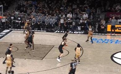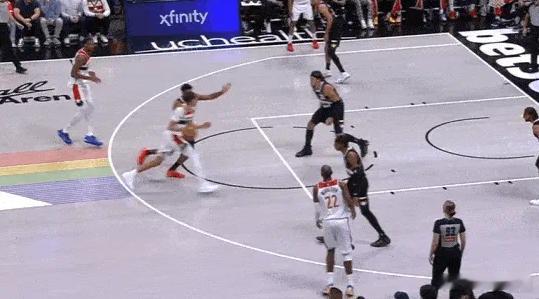 15、16、17、18乔治双胯下起手衔接挡拆随后立即左手大力炸球的同时上步蹬地,完成合球的同时使用撤步,随即出手持球三分。