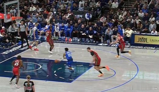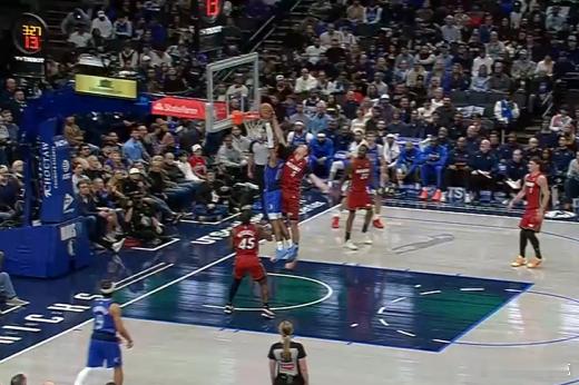 18小克接队友上球持球过半场立即使用小跳步衔接一二步急停,持球追身三分手起刀落。