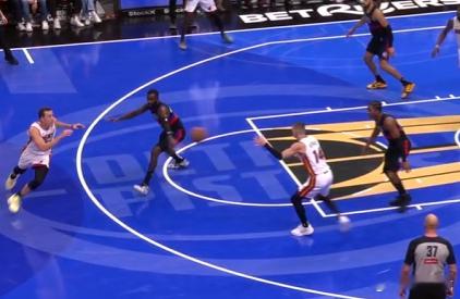 12345希罗回传给邓罗随即迅速为其设置“幽灵掩护”,外弹至弧顶接球后立即启动突破直杀篮下,杀入禁区深处吸引弱侧CC回收后使用一记跳起单手大横传找到被放空的海史密斯,海史密斯接球三分稳稳命中。