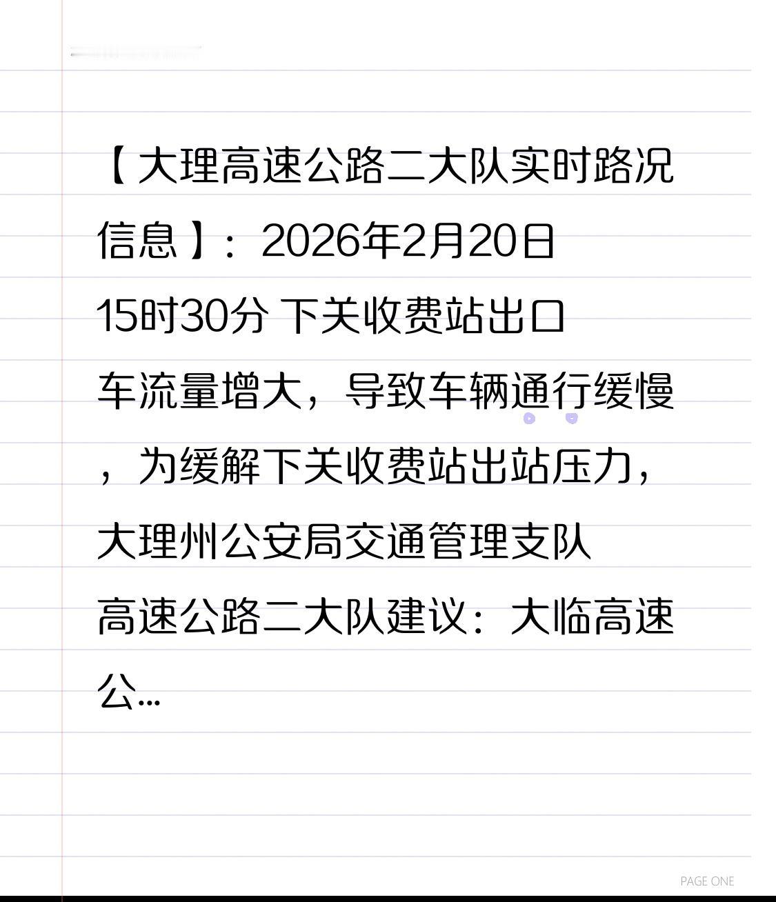 【大理高速公路二大队实时路况信息】: 2026年2月20日15时30分 下关收费站出口车流量增大,导致车辆通行缓慢,为缓解下关收费站出站压力,大理州公安局交通管理支队高速公路二大队建议:大临高速公路巍山往下关方向的车辆从凤仪收费站出或绕行大丽高速至云浪收费站后驶出高速。 【路况提示】2026年2月20日13时20分:G5621昆楚大高速广通—大理路段,双向车流持续增多,部分路段通行缓慢。 交警提示:请广大驾驶员控制车速,谨慎驾驶,保持车距,切勿随意变道,以免引发交通事故。