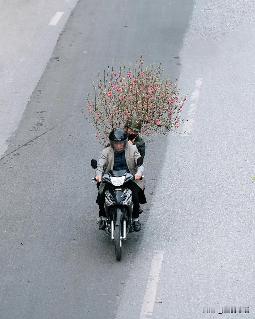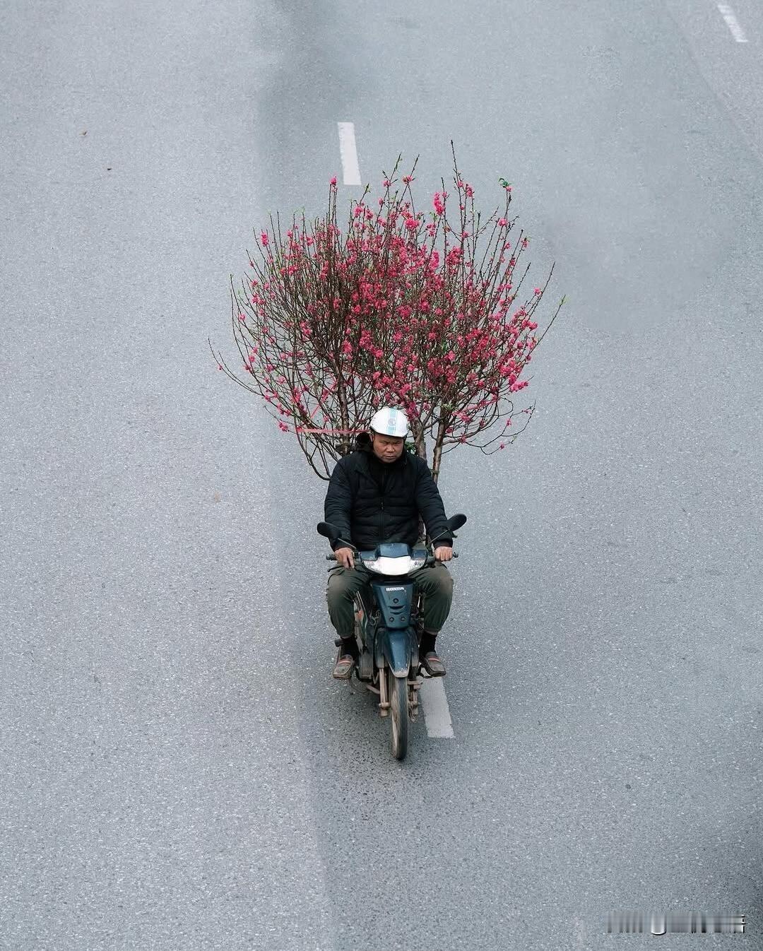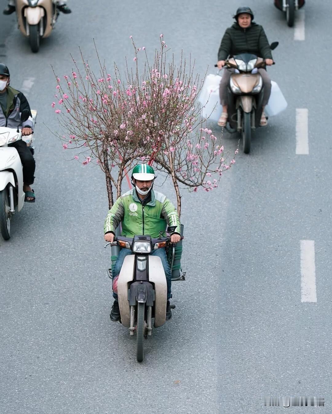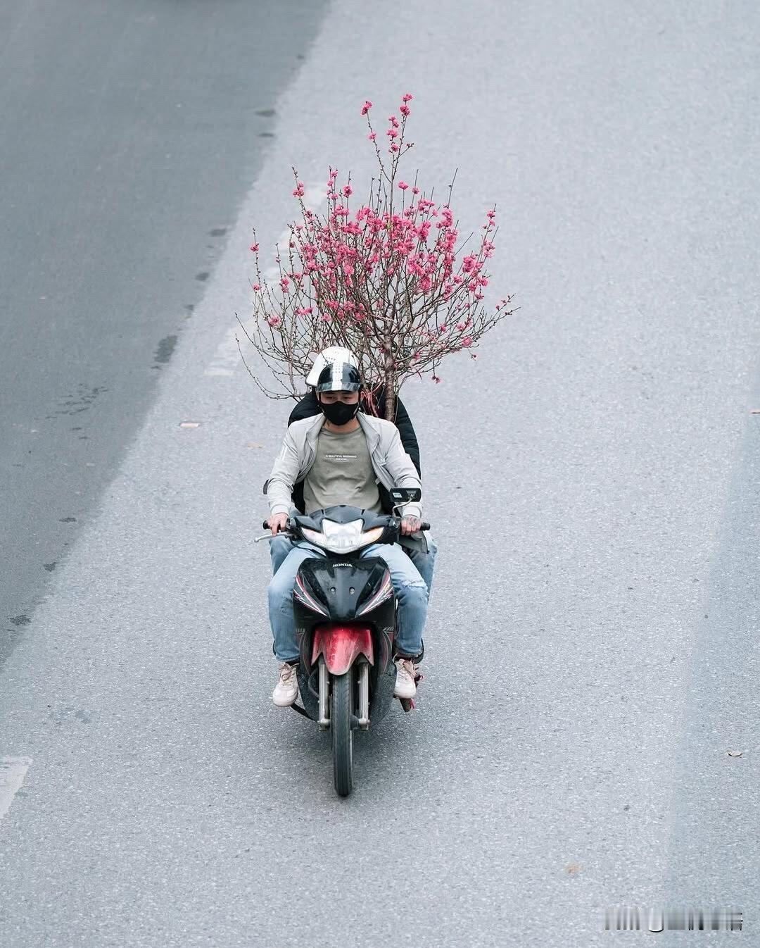 越南人独特的过春节仪式 载一树桃花回家过年! 春节前的河内街头, 到处都是骑小摩托的人。 后座绑着满满一树桃花, 晃晃悠悠往家赶。 这是他们过年,雷打不动的仪式。 对越南人来说, 这年花可不是随便的装饰。 北方过年,桃花是灵魂, 能驱邪保平安,红通通的花色, 就图个来年兴旺。 南方天热,就换金黄的黄梅, 还有寓意吉祥招财的金桔树, 家家户户都少不了。 有钱就买大棵的,没钱就买小棵的。 哪怕平时不买花,过年这趟花市也必须逛。 去别人家做客, 夸一句他家的年花养得好, 主人能乐呵呵跟你聊半天。 其实说到底,过年哪分什么国界啊。 不管有钱没钱, 都要把满当当的春意和好彩头带回家。 这份热热闹闹的盼头,就是年最动人的样子。