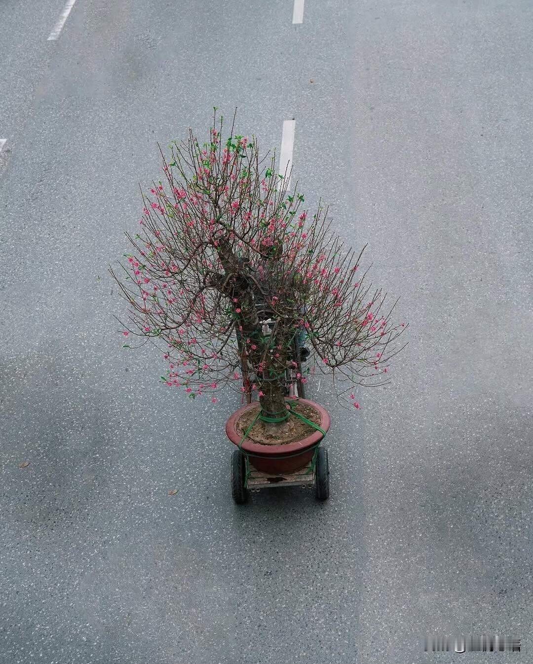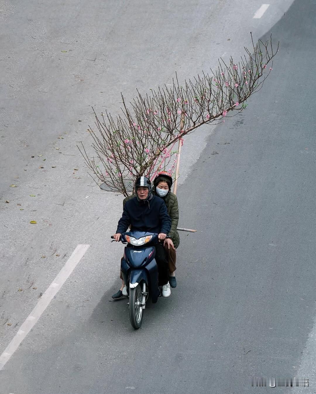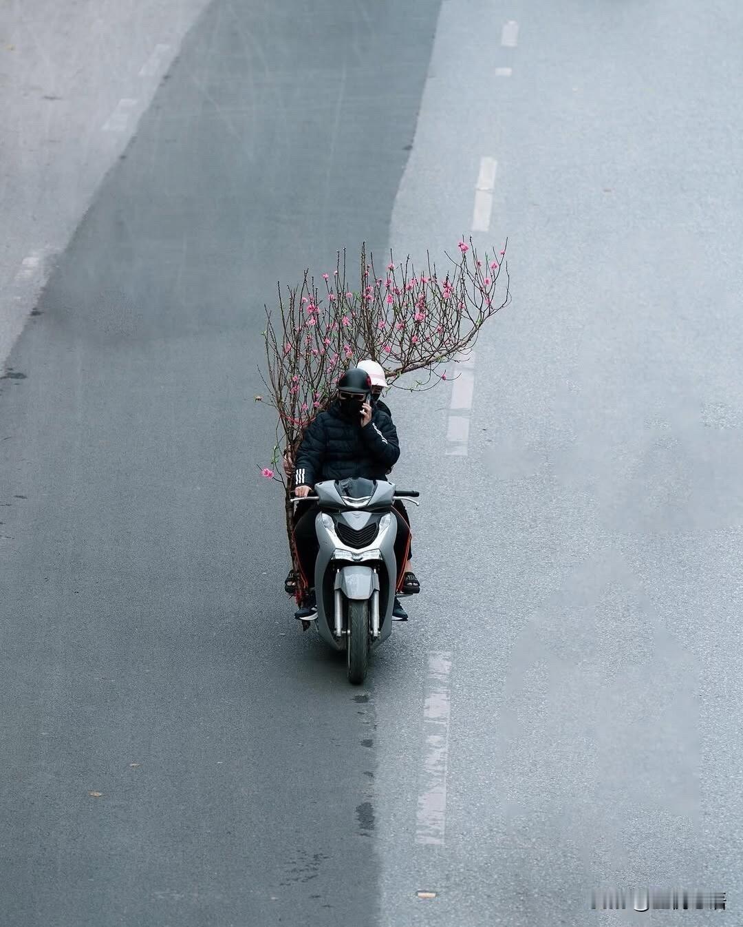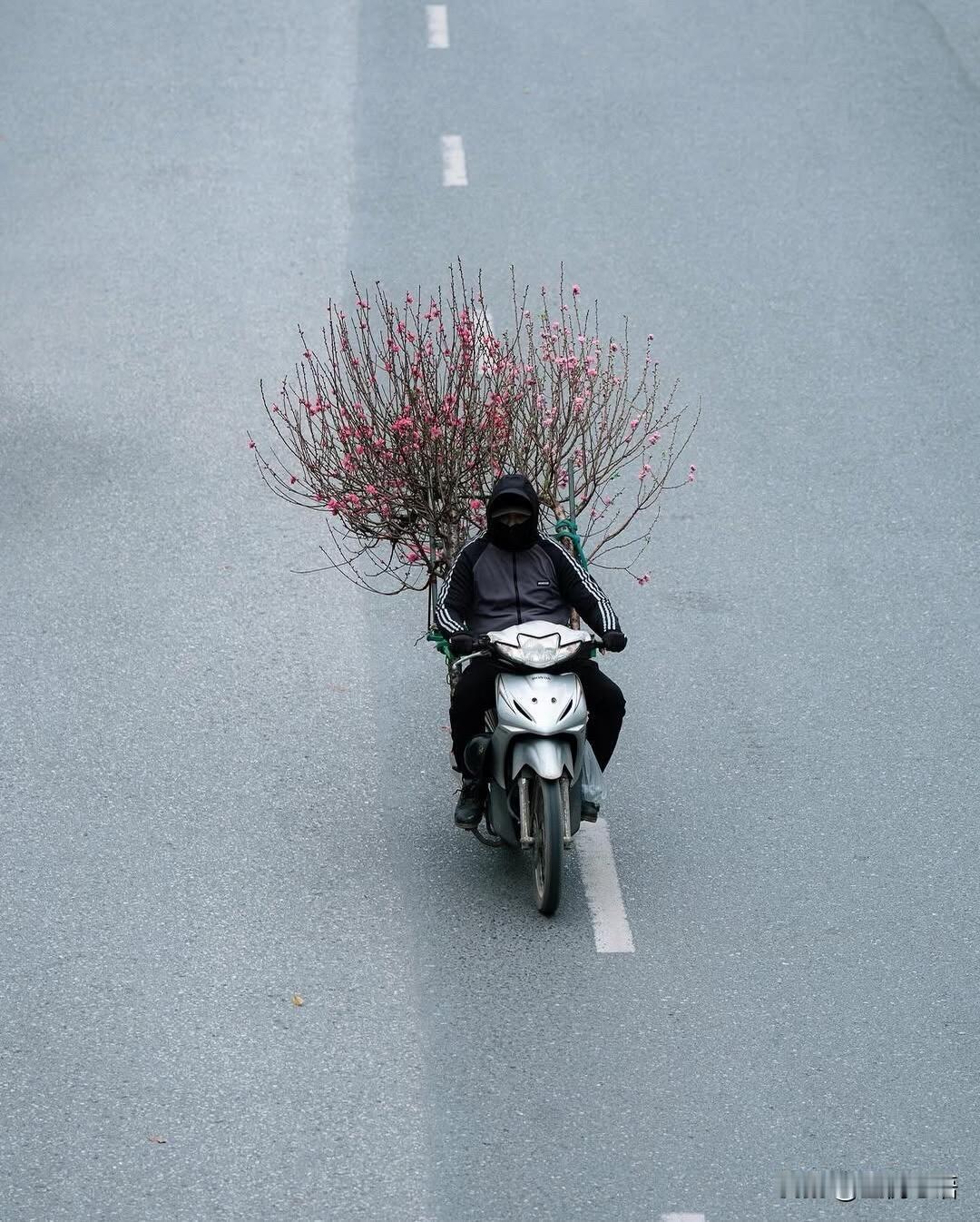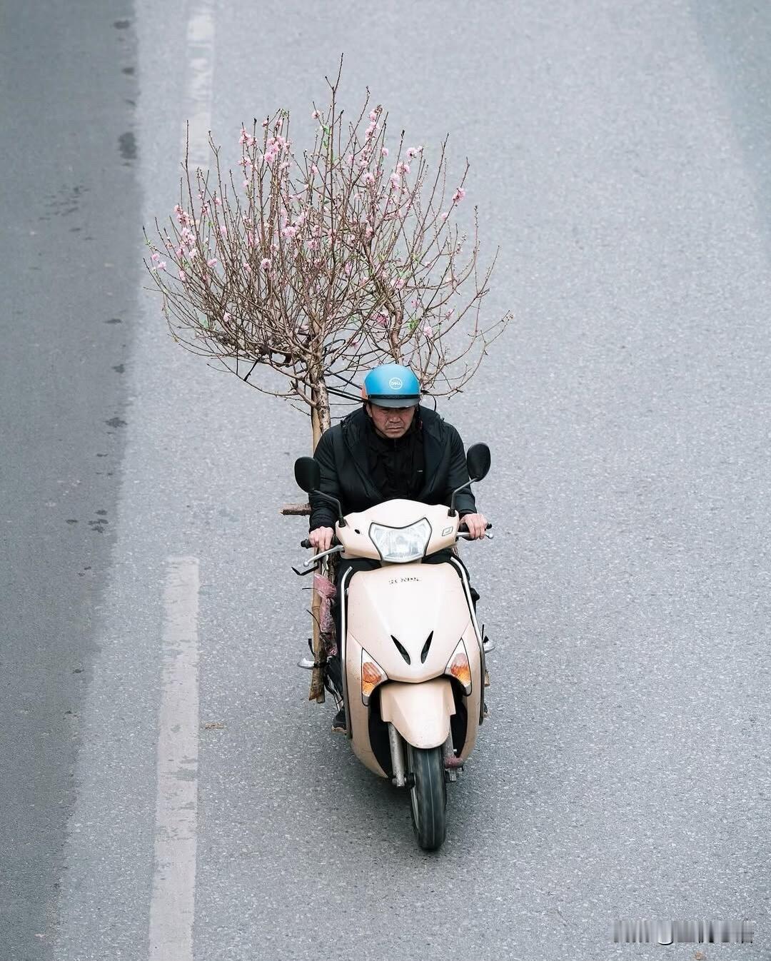 越南人独特的过春节仪式 载一树桃花回家过年! 春节前的河内街头, 到处都是骑小摩托的人。 后座绑着满满一树桃花, 晃晃悠悠往家赶。 这是他们过年,雷打不动的仪式。 对越南人来说, 这年花可不是随便的装饰。 北方过年,桃花是灵魂, 能驱邪保平安,红通通的花色, 就图个来年兴旺。 南方天热,就换金黄的黄梅, 还有寓意吉祥招财的金桔树, 家家户户都少不了。 有钱就买大棵的,没钱就买小棵的。 哪怕平时不买花,过年这趟花市也必须逛。 去别人家做客, 夸一句他家的年花养得好, 主人能乐呵呵跟你聊半天。 其实说到底,过年哪分什么国界啊。 不管有钱没钱, 都要把满当当的春意和好彩头带回家。 这份热热闹闹的盼头,就是年最动人的样子。