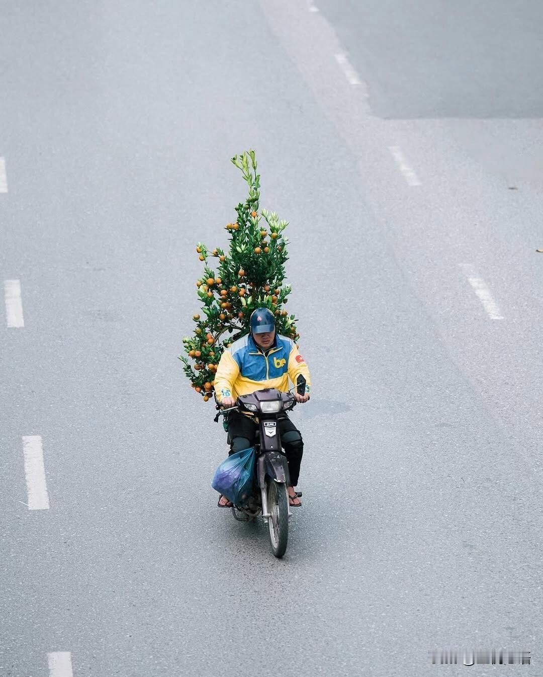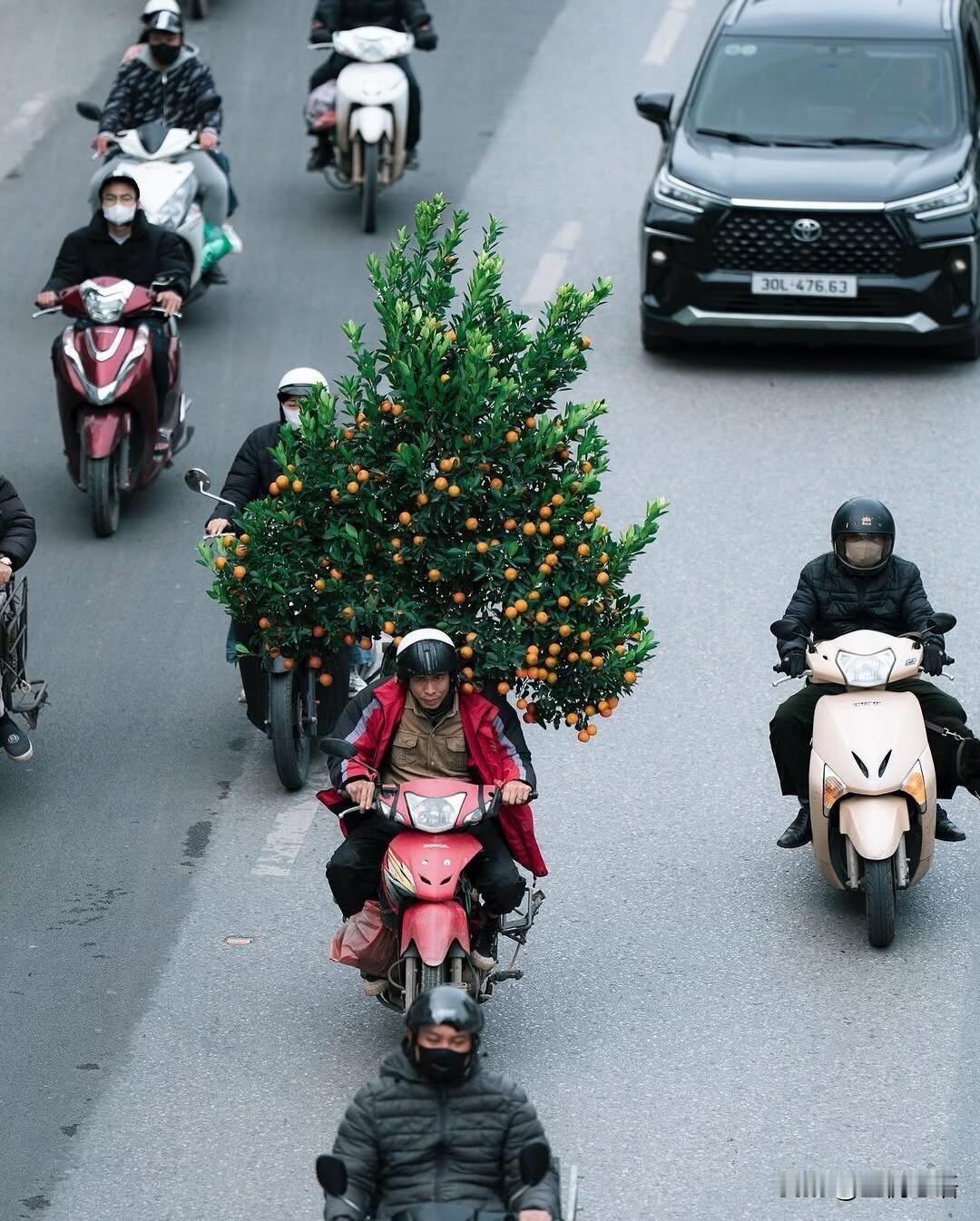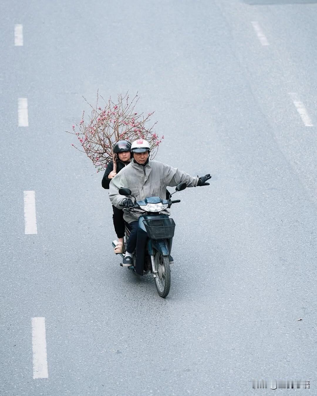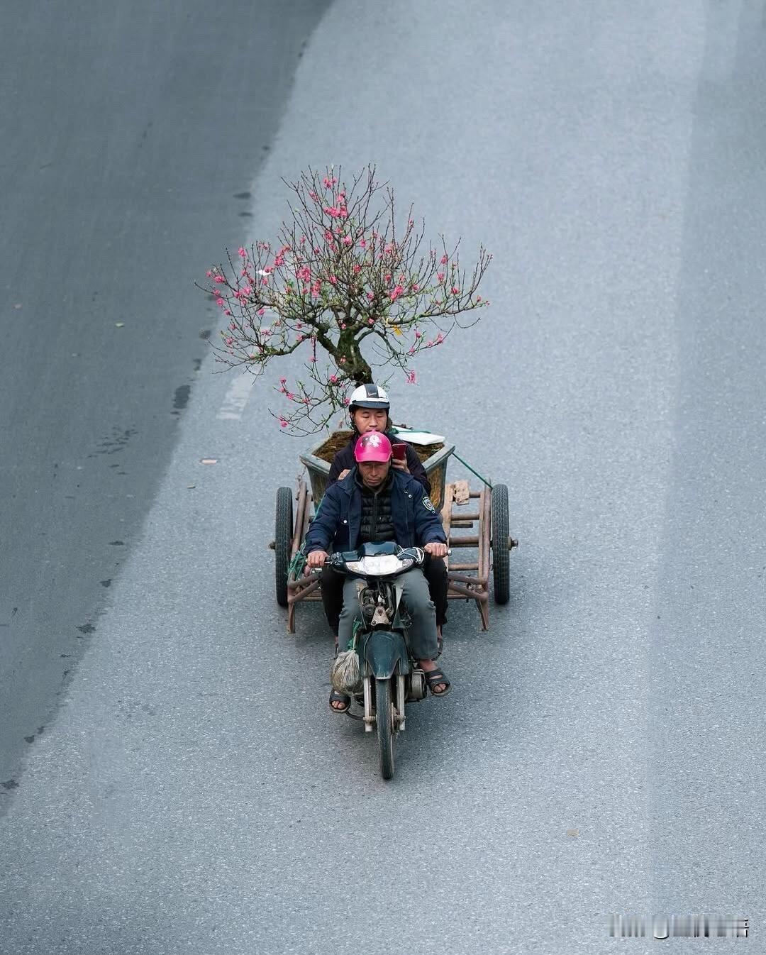 越南人独特的过春节仪式 载一树桃花回家过年! 春节前的河内街头, 到处都是骑小摩托的人。 后座绑着满满一树桃花, 晃晃悠悠往家赶。 这是他们过年,雷打不动的仪式。 对越南人来说, 这年花可不是随便的装饰。 北方过年,桃花是灵魂, 能驱邪保平安,红通通的花色, 就图个来年兴旺。 南方天热,就换金黄的黄梅, 还有寓意吉祥招财的金桔树, 家家户户都少不了。 有钱就买大棵的,没钱就买小棵的。 哪怕平时不买花,过年这趟花市也必须逛。 去别人家做客, 夸一句他家的年花养得好, 主人能乐呵呵跟你聊半天。 其实说到底,过年哪分什么国界啊。 不管有钱没钱, 都要把满当当的春意和好彩头带回家。 这份热热闹闹的盼头,就是年最动人的样子。