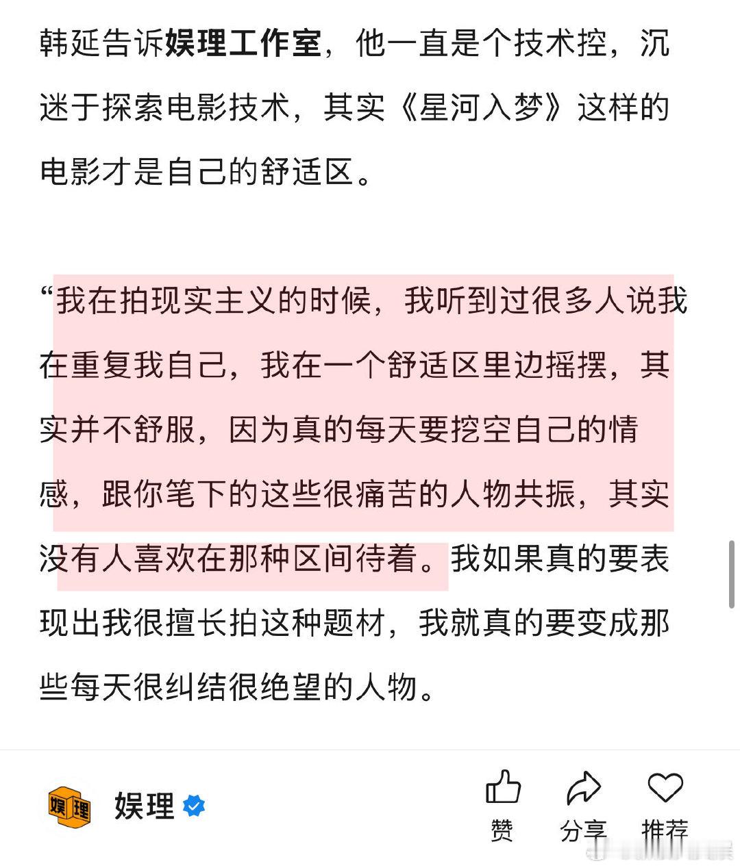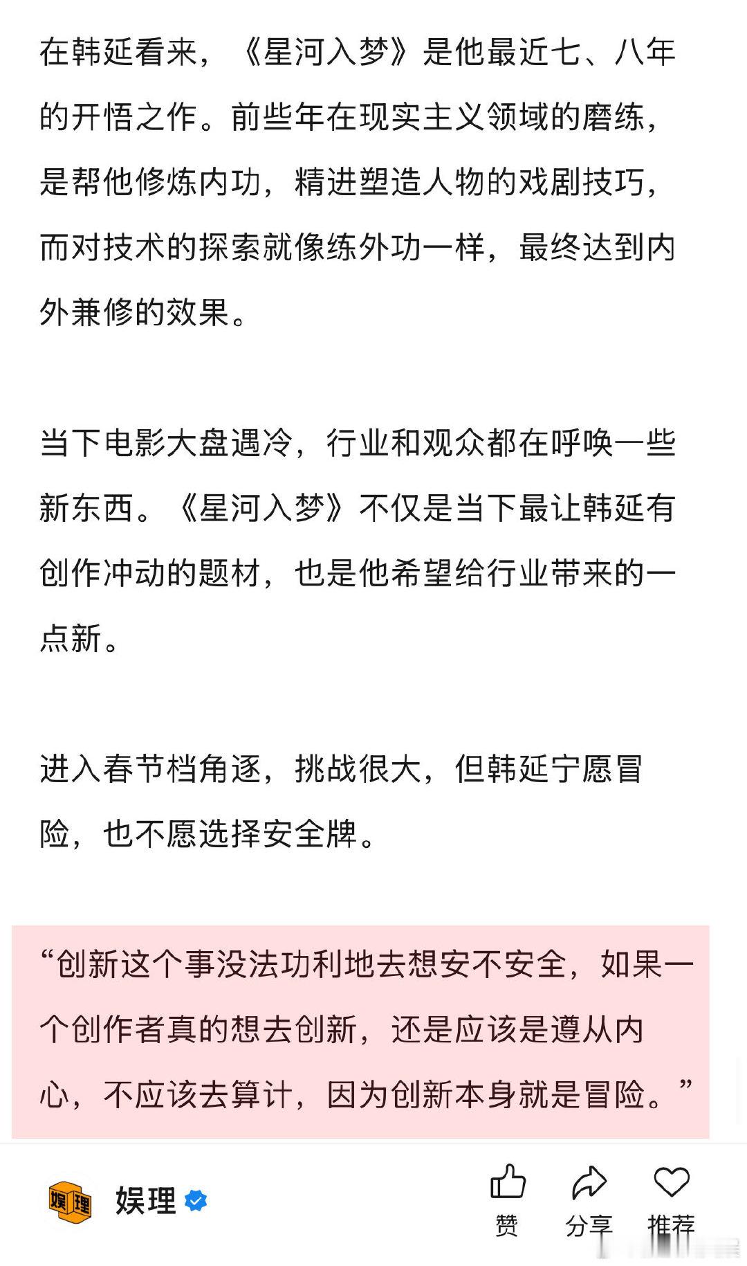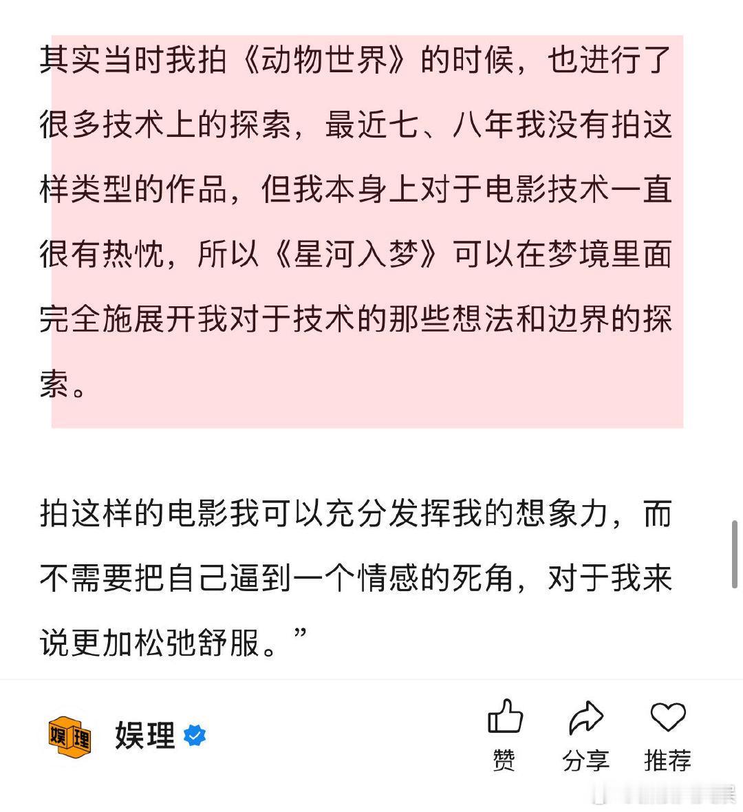 导演说王鹤棣宋茜是战友情 星河入梦导演说王鹤棣有使不完的劲 导演韩延称自己是技术控,沉迷于探索电影技术,《星河入梦》这样的电影才是他的舒适区。“最近七、八年我没有拍这样类型的作品,但我本身上对于电影技术一直很有热忱,所以《星河入梦》可以在梦境里面完全施展开我对于技术的那些想法和边界的探索…”娱理独家↓