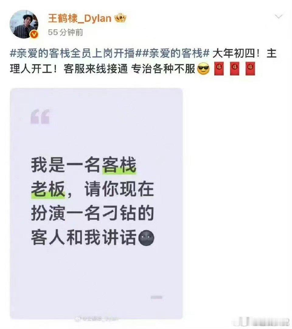 王鹤棣大年初四开工亲爱的客栈开工第一天,把 “想躺平” 换成 “棣式冲劲”。2026,搞事业最重要。