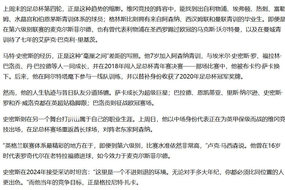 如今的英格兰低级别联赛,早已不再只是“流浪球员”的聚集地。越来越多球队的阵容里,站着的是那些曾无限接近英超舞台、却因伤病、运气或残酷竞争而改写轨迹的球员——他们与顶级联赛只差一步,却走上了另一条路。 上周末的足总杯第四轮,正是这种趋势的缩影。维冈竞技的阵容中,能找到出自利物浦、埃弗顿、热刺、富勒姆、水晶宫和伯恩茅斯青训体系的球员;格林斯比则拥有来自阿森纳、西汉姆联和曼联青训的毕业生。即便是在第六级别联赛的麦克尔斯菲尔德,也有曾代表利物浦在圣西罗踢过欧冠的马克斯·沃尔特曼,以及在曼城青训待了七年的艾萨克·巴克利-里基茨。 马特·史密斯的经历,正是这种“毫厘之间”差距的写照。他7岁加入阿森纳青训,与埃米尔·史密斯·罗、福拉林·巴洛贡、丹·巴拉德等人一同成长,并在2018年闯入足总杯青年赛决赛——那场比赛中,他被布卡约·萨卡换下。后来,他在阿尔特塔麾下参与一线队训练,并以替补身份收获了2020年足总杯冠军奖牌。 然而,他的人生轨迹与昔日队友分道扬镳。萨卡成长为超级巨星;巴拉德、恩凯蒂亚、里斯·纳尔逊、史密斯·罗和乔·威洛克都在英超站稳脚跟;巴洛贡则征战欧冠赛场。 史密斯则在另一个舞台打拼出属于自己的职业生涯。上周日,他以中场身份代表正在为英甲保级而战的维冈竞技出场,在足总杯赛场重返酋长球场,对阵老东家阿森纳。 “英格兰联赛体系最精彩的地方在于,即便到第六级别,比赛水准依然非常高,”卢克·马西森说。他曾在16岁时代表罗奇代尔在老特拉福德进球,如今效力于麦克尔斯菲尔德。 史密斯在2024年接受采访时坦言:“这里是一个不进则退的环境。无论对手多大年纪,你都必须比同位置的人更出色。”而他当年的竞争目标,正是格拉尼特·扎卡。 在英格兰足球联赛(EFL)的72家俱乐部中,有67家设有青训学院。EFL首席运营官尼克·克雷格透露,除去专项资助外,各队在青训方面的投入已超过1亿美元。 “我们看到不少俱乐部正努力将青训等级从第三级提升到第二级,那是一次巨大的跨越。”克雷格说。