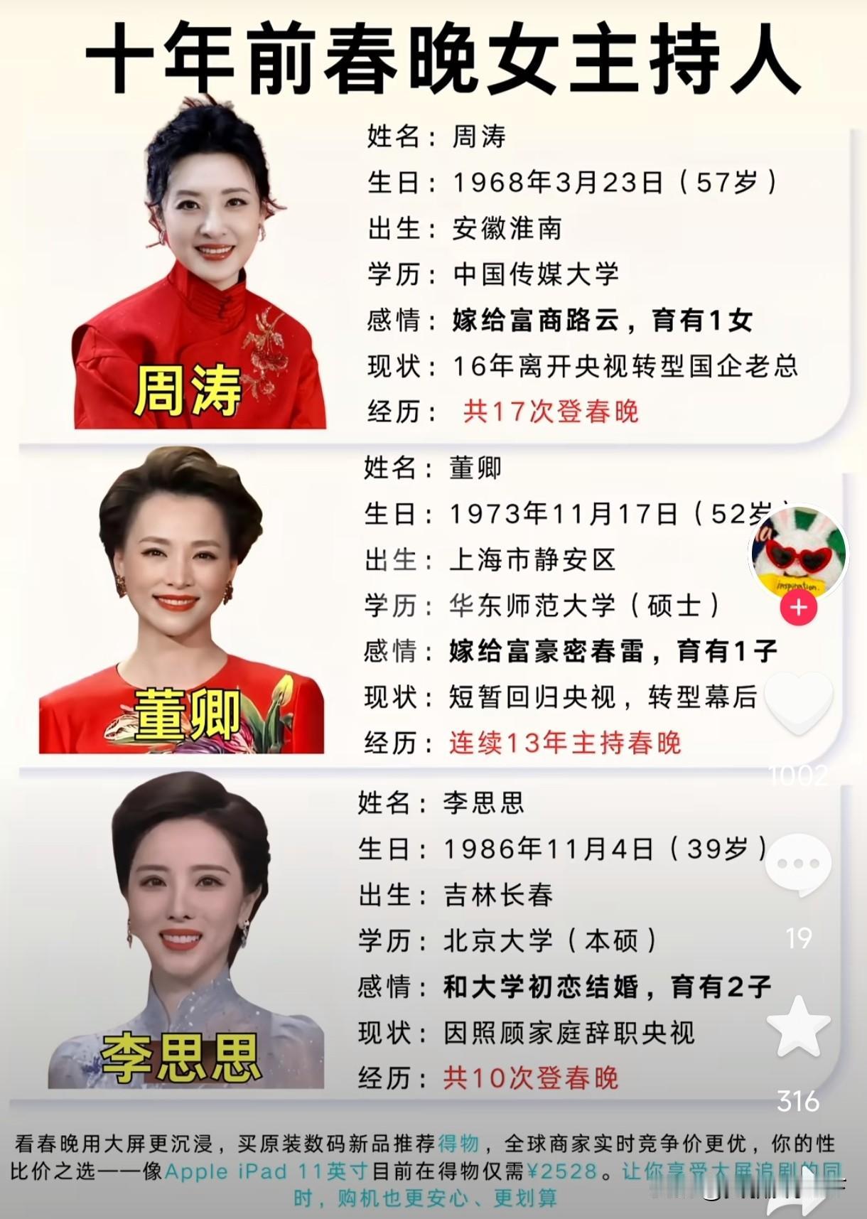 周涛、董卿、李思思,曾是央视春晚舞台上的“当家女神”,各有各的气质与风采。 周涛端庄大气、稳得住场,连续17次主持央视春晚,是春晚女主持纪录保持者之一,也是大家心中最有气场的“国脸”主持,现在专注做文化演出,气质依旧优雅。 董卿知性温柔、腹有诗书,主持春晚多年,《中国诗词大会》《朗读者》更是圈粉无数,有才又有温度,越看越有魅力。 李思思年轻清秀、北大才女,25岁就站上春晚,是当年最年轻的春晚主持,连续主持多届,温柔大方、气质干净,很受观众喜欢。 三代央视女主持,端庄、知性、清新,各有韵味,陪伴了无数人的春晚记忆!