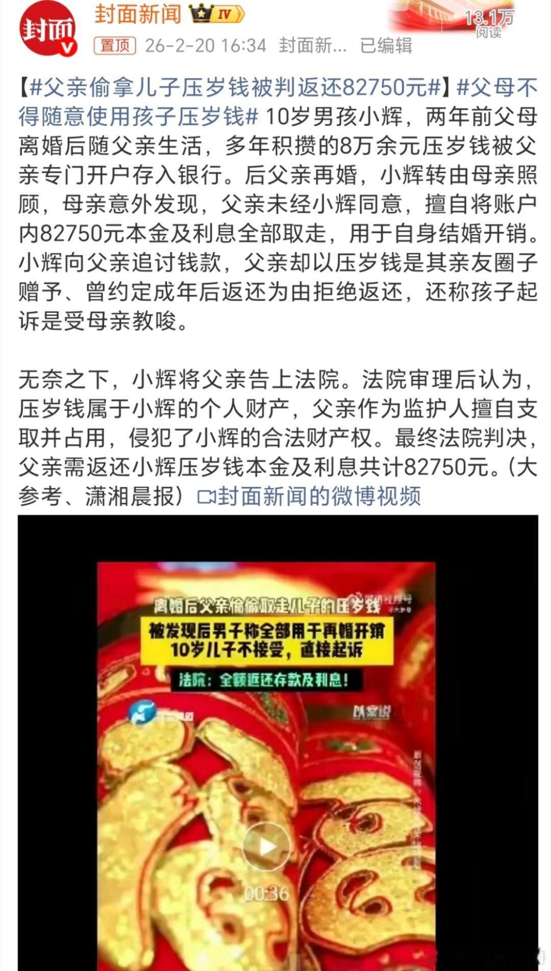 父亲偷拿儿子压岁钱被判返还82750元都离婚了,为什么还要动儿子的💰呢?还是用来结婚,这真的不能怪母亲教唆