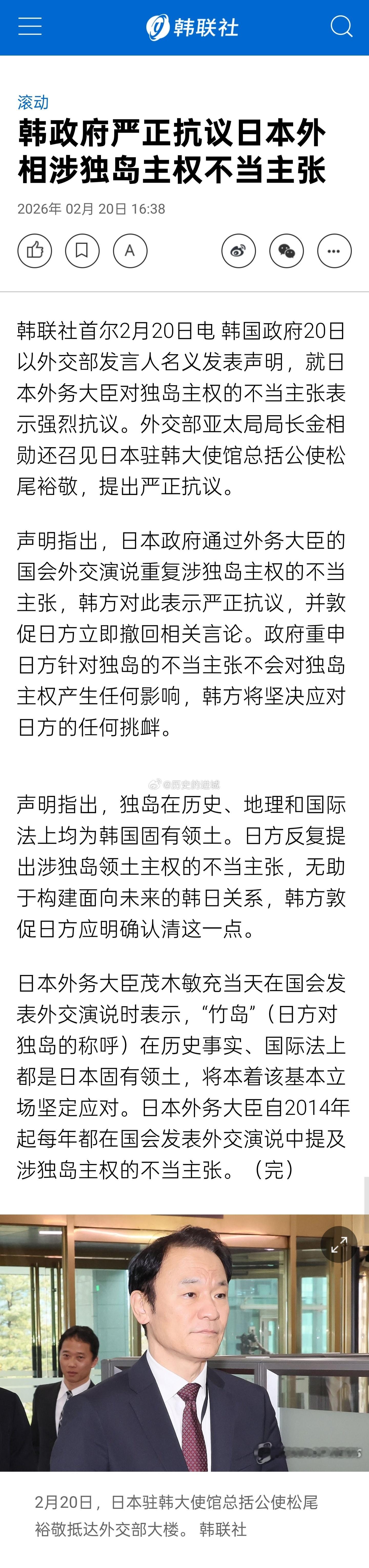 韩国政府20日以外交部发言人名义发表声明,就日本外务大臣对独岛主权的不当主张表示强烈抗议。外交部亚太局局长金相勋还召见日本驻韩大使馆总括公使松尾裕敬,提出严正抗议。昨天刚说今天就抗议了。海外新鲜事