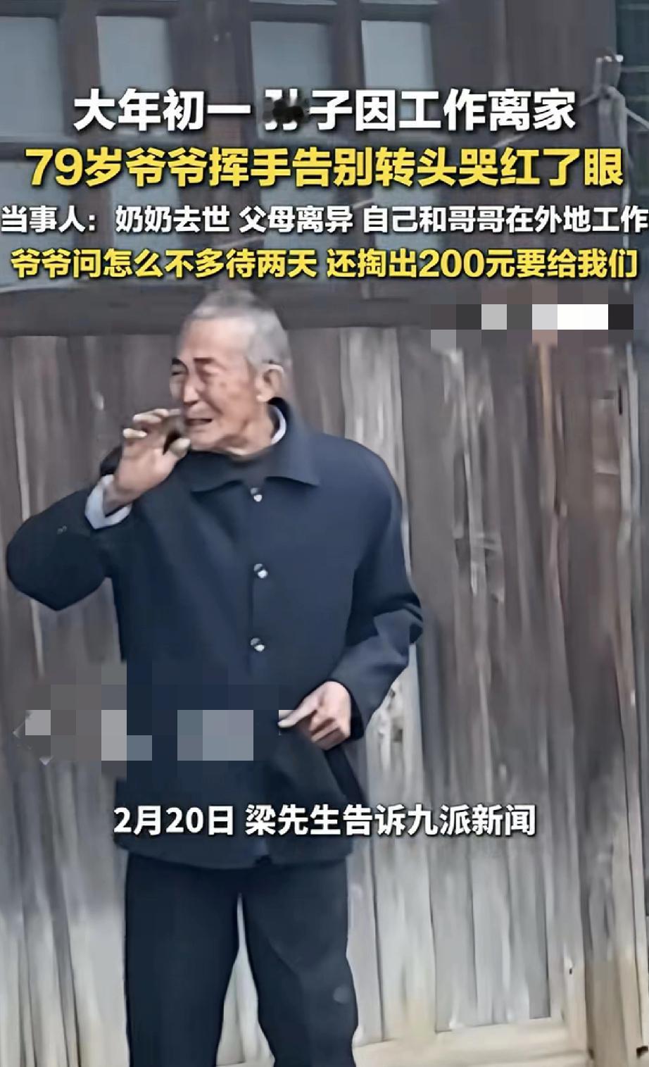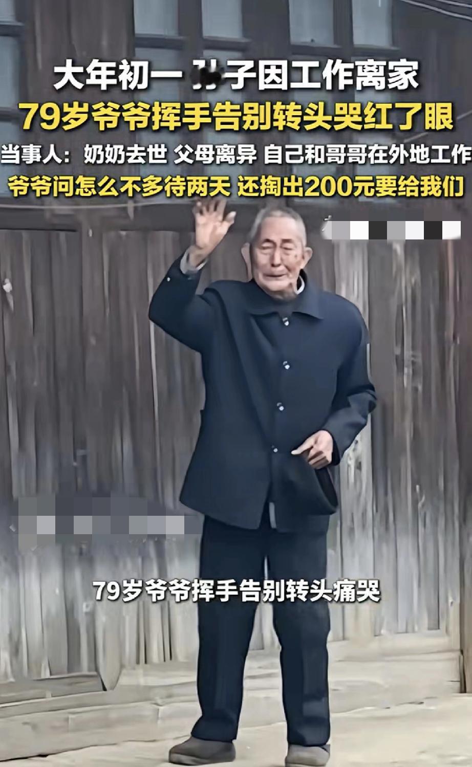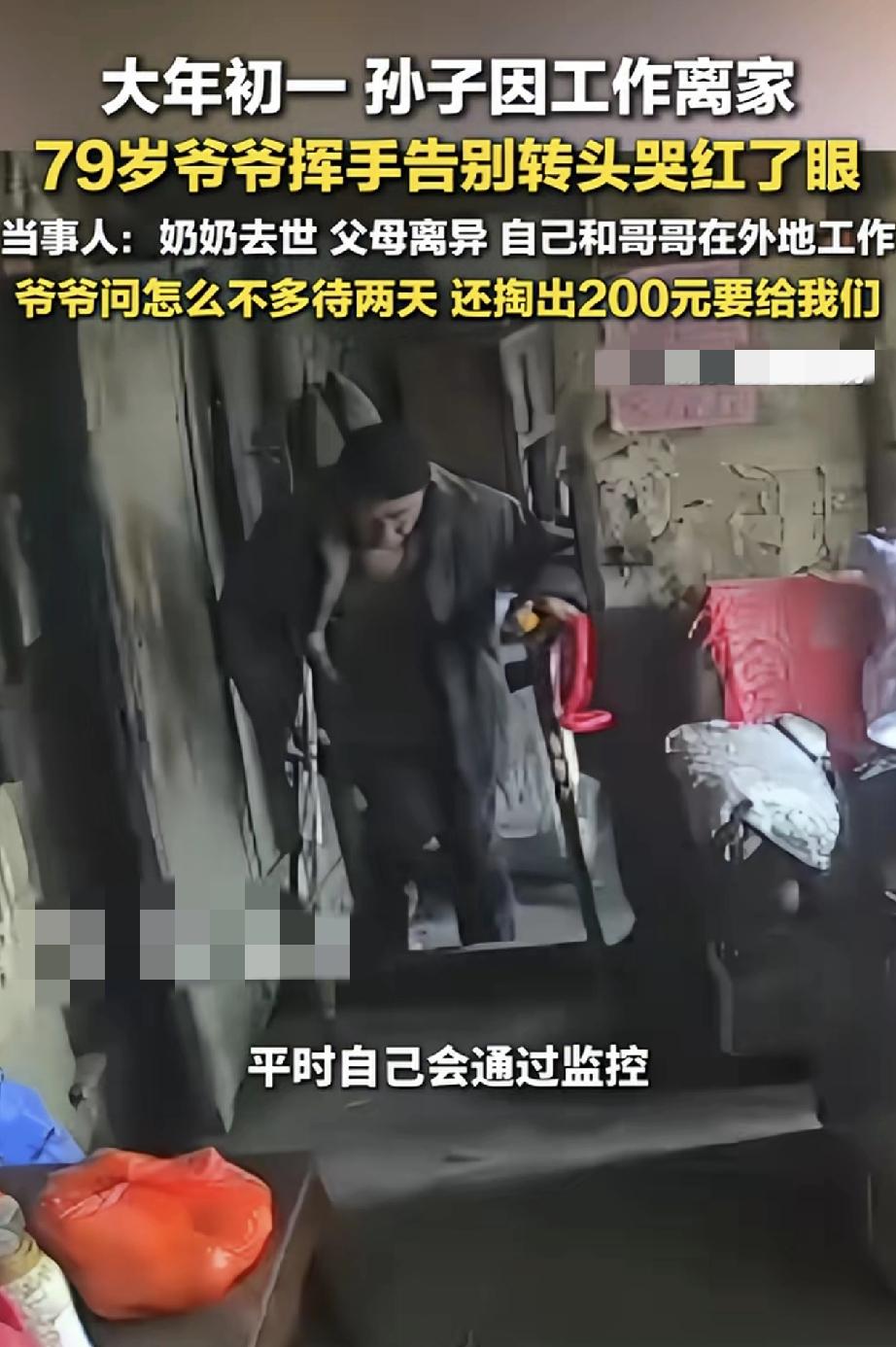 心酸。贵州遵义,一男子大年初一无奈要离家工作,临走时,男子爷爷在家门口目送痛哭的一幕,让男子心酸不已。之后男子又通过监控,看着爷爷独自一人坐在家里发呆的模样时,再也忍不住的泪目了。 据男子介绍,他的奶奶已经去世了,他父母也已离异,为了养家糊口,他和哥哥一直在外地工作,留得爷爷独自生活。虽然平时男子也会通过监控,陪爷爷聊聊天说说话,但爷爷还是非常想念他们,他们也非常担心爷爷。 而今年又因工作原因,他和哥哥不得不大年初一就要回去上班。当男子临走时,将此事告诉爷爷后,爷爷也是不舍问道怎么不多待两天,说着说着爷爷就哭了起来。 视频可见,男子和哥哥无奈离开家时,爷爷满眼心疼的在门口目送他们,当看到他们离去时,爷爷又忍不住的哭了起来。 此时男子和哥哥心里也是五味杂陈,虽然他们也万般不舍,但为了生活,他们也是无可奈何。 更让男子心酸的是,之后男子通过查看爷爷情况,却看到爷爷一个人坐在屋里发呆,此时此刻,男子再也没忍住的泪流满面了。 对此男子也决心,以后一定要多挣钱,有时间多陪陪爷爷,带爷爷出去玩,尽可能把爷爷带在身边。 不得不说,看着爷爷泪流满面,对孙子不舍送别的模样时,让人心酸泪目了。一年到头,爷孙可能都见不上两面,好不容易有个团圆新年,孙子却又因工作原因不得不赶回去上班。 可以想象,特别是过年时节,这也是老人对亲人团聚的一种极大期盼,此时爷爷是有多么舍不得孙子们离去。因为爷爷心里知道,这一挥手又怕要等一年,怕没几个一年再等了。 或许正如网友所说,成年人有太多的不易和无奈,如果能把爷爷带在身边该多好啊,希望当地政府能够看到,让这留守老人也能老有所依,有时尽孝也需要政府的帮助呀! 对此大家怎么看?